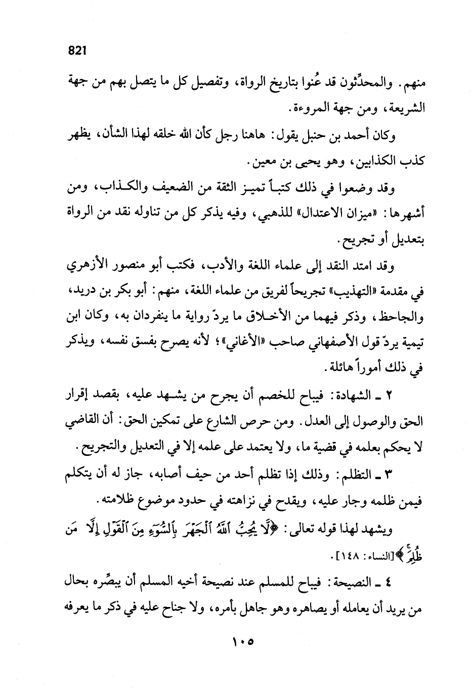 وقد امتد النقد إلى علماء اللغة والأدب، فكتب أبو منصور الأزهري في مقدمة "التهذيب" تجريحاً لفريق من علماء اللغة، منهم: أبو بكر بن دريد، والجاحظ، وذكر فيهما من الأخلاق ما يردّ رواية ما ينفردان به، وكان ابن تيمية يردّ قول الأصفهاني صاحب "الأغاني"؛ لأنه يصرح بفسق نفسه، ويذكر في ذلك أموراً هائلة.