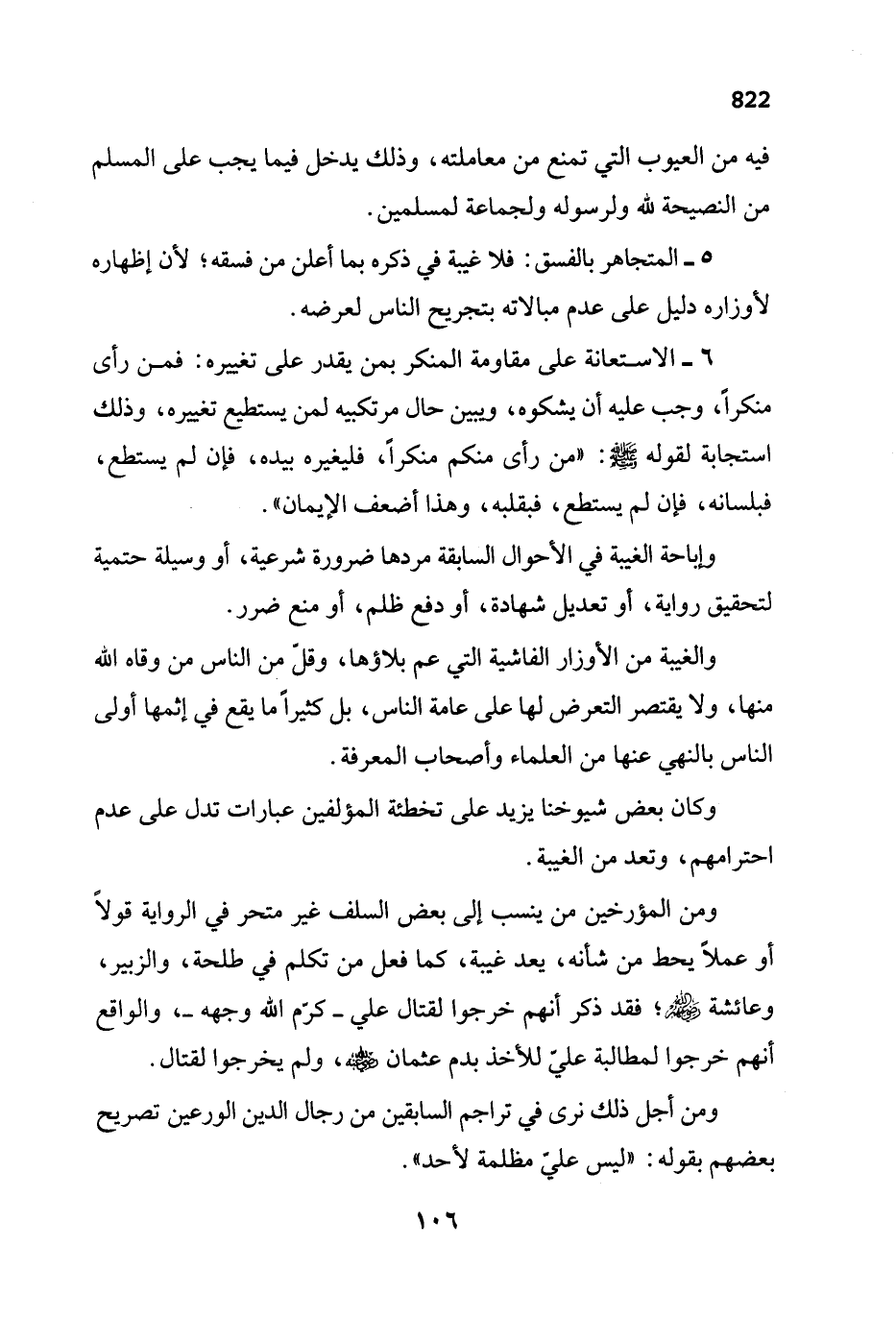 ومن المؤرخين من ينسب إلى بعض السلف غير متحر في الرواية قولاً أو عملاً يحط من شأنه، يعد غيبة، كما فعل من تكلم في طلحة، والزبير، وعائشة - رضي الله عنهم -؛ فقد ذكر أنهم خرجوا لقتال علي - كرّم الله وجهه -, والواقع أنهم خرجوا لمطالبة عليّ للأخذ بدم عثمان - رضي الله عنه -، ولم يخرجوا لقتال.