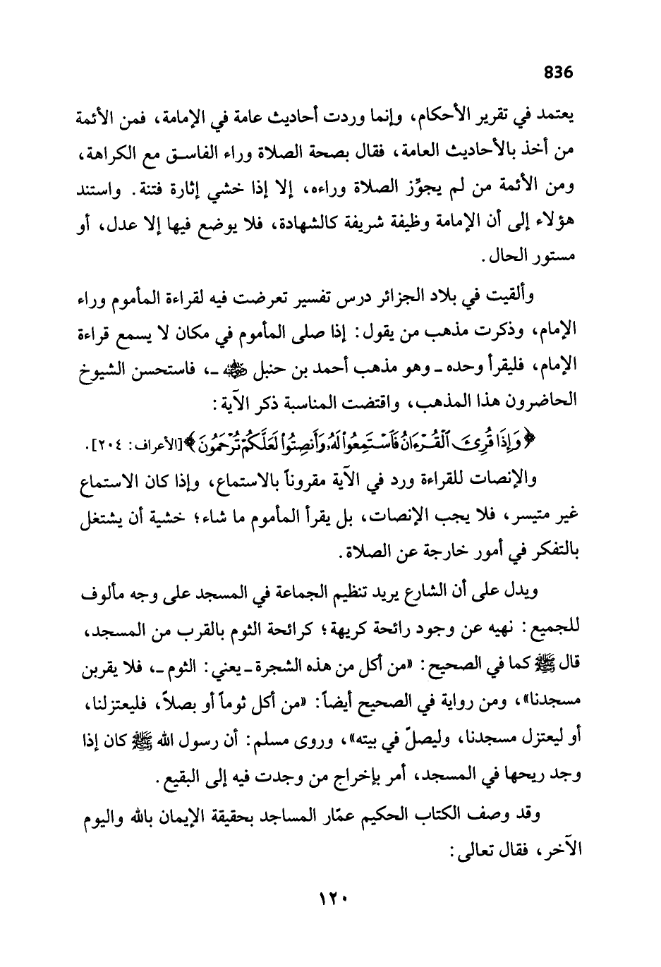 وألقيت في بلاد الجزائر درس تفسير تعرضت فيه لقراءة المأموم وراء الإمام، وذكرت مذهب من يقول: إذا صلى المأموم في مكان لا يسمع قراءة الإمام، فليقرأ وحده - وهو مذهب أحمد بن حنبل - رضي الله عنه - فاستحسن الشيوخ الحاضرون هذا المذهب، واقتضت المناسبة ذكر الآية: