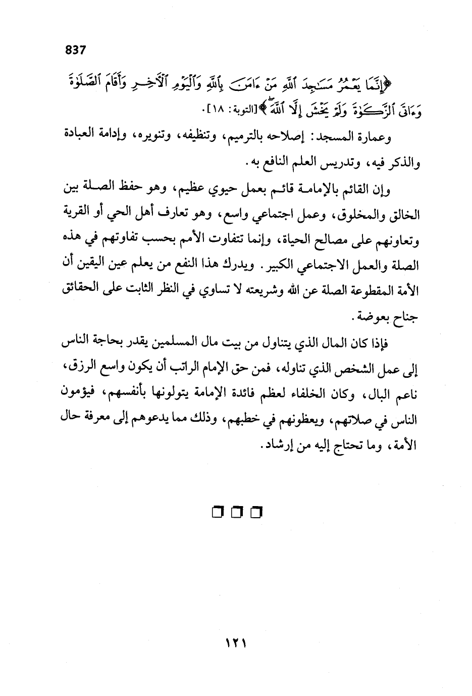وإن القائم بالإمامة قائم بعمل حيوي عظيم، وهو حفظ الصلة بين الخالق والمخلوق، وعمل اجتماعي واسع، وهو تعارف أهل الحي أو القرية وتعاونهم على مصالح الحياة، وإنما تتفاوت الأمم بحسب تفاوتهم في هذه الصلة والعمل الاجتماعي الكبير. ويدرك هذا النفع من يعلم عين اليقين أن الأمة المقطوعة الصلة عن الله وشريعته لا تساوي في النظر الثابت على الحقائق جناح بعوضة.