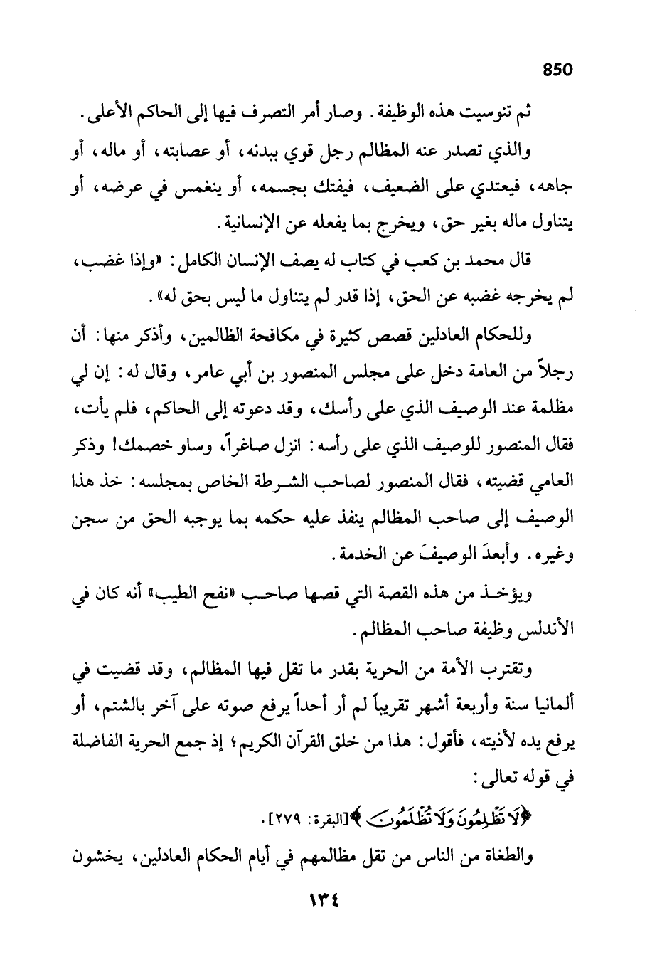 وتقترب الأمة من الحرية بقدر ما تقل فيها المظالم، وقد قضيت في ألمانيا سنة وأربعة أشهر تقريباً لم أر أحداً يرفع صوته على آخر بالشتم، أو يرفع يده لأذيته، فأقول: هذا من خلق القرآن الكريم؛ إذ جمع الحرية الفاضلة في قوله تعالى: