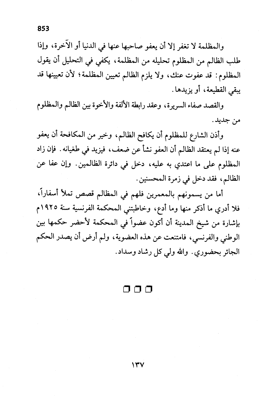 أما من يسمونهم بالمعمرين فلهم في المظالم قصص تملأ أسفاراً، فلا أدري ما أذكر منها وما أدع، وخاطبتني المحكمة الفرنسية سنة 1925 م بإشارة من شيخ المدينة أن أكون عضواً في المحكمة لأحضر حكمها بين الوطني والفرنسي، فامتنعت عن هذه العضوية، ولم أرض أن يصدر الحكم الجائر بحضوري. والله ولي كل رشاد وسداد.