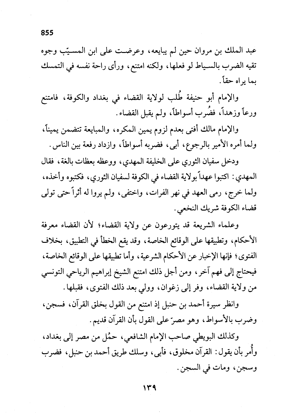 وانظر سيرة أحمد بن حنبل إذ امتنع من القول بخلق القرآن، فسجن، وضرب بالأسواط، وهو مصرّ على القول بأن القرآن قديم.
