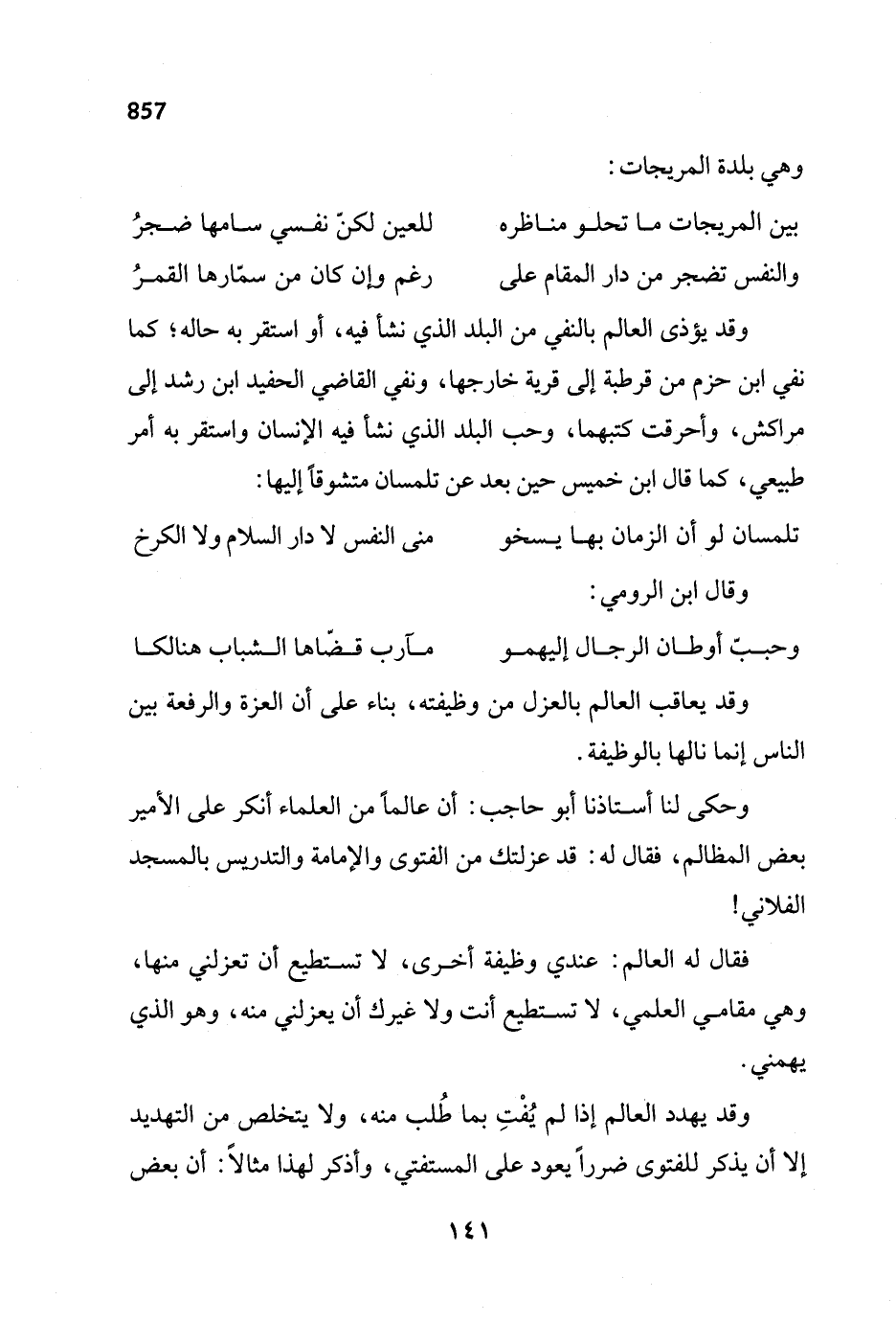 وقد يؤذى العالم بالنفي من البلد الذي نشأ فيه، أو استقر به حاله؛ كما نفي ابن حزم من قرطبة إلى قرية خارجها، ونفي القاضي الحفيد ابن رشد إلى مراكش، وأحرقت كتبهما، وحب البلد الذي نشأ فيه الإنسان واستقر به أمر طبيعي، كما قال ابن خميس حين بعد عن تلمسان متشوقاً إليها: