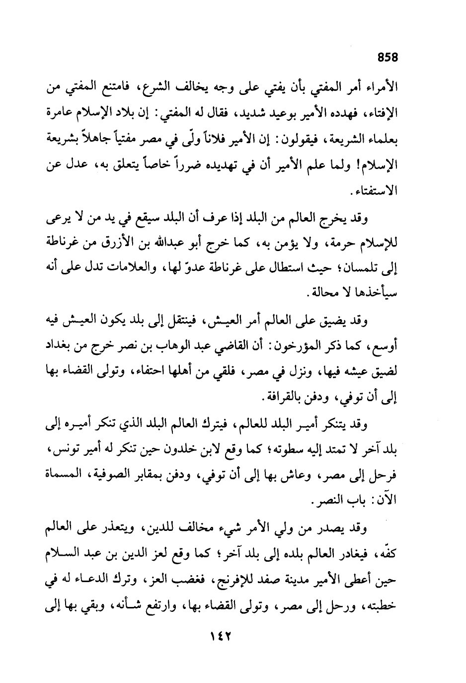 وقد يصدر من ولي الأمر شيء مخالف للدين، ويتعذر على العالم كفّه، فيغادر العالم بلده إلى بلد آخر؛ كما وقع لعز الدين بن عبد السلام حين أعطى الأمير مدينة صفد للإفرنج، فغضب العز، وترك الدعاء له في خطبته، ورحل إلى مصر، وتولى القضاء بها، وارتفع شأنه، وبقي بها إلى