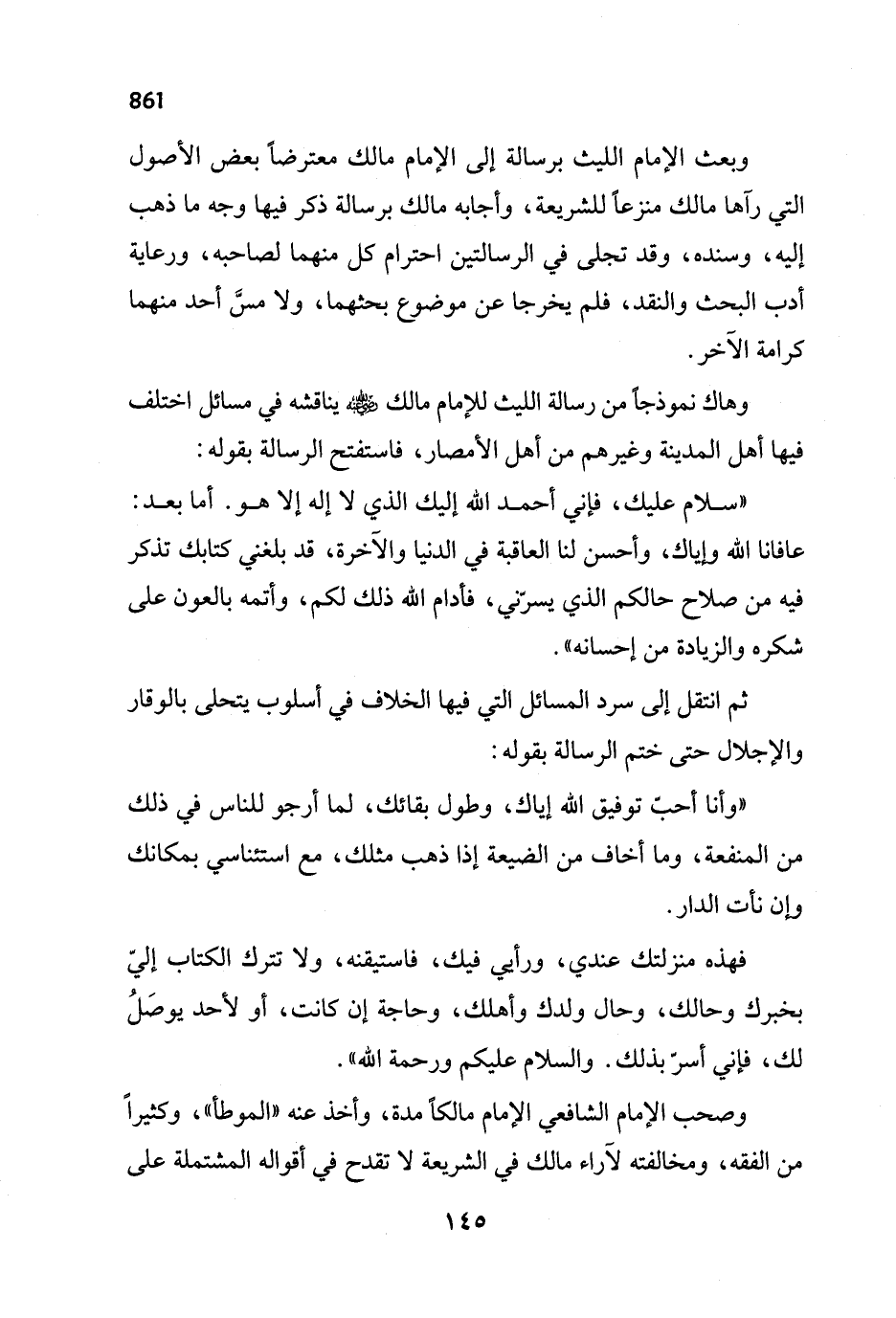 وهاك نموذجاً من رسالة الليث للإمام مالك - رضي الله عنه - يناقشه في مسائل اختلف فيها أهل المدينة وغيرهم من أهل الأمصار، فاستفتح الرسالة بقوله: