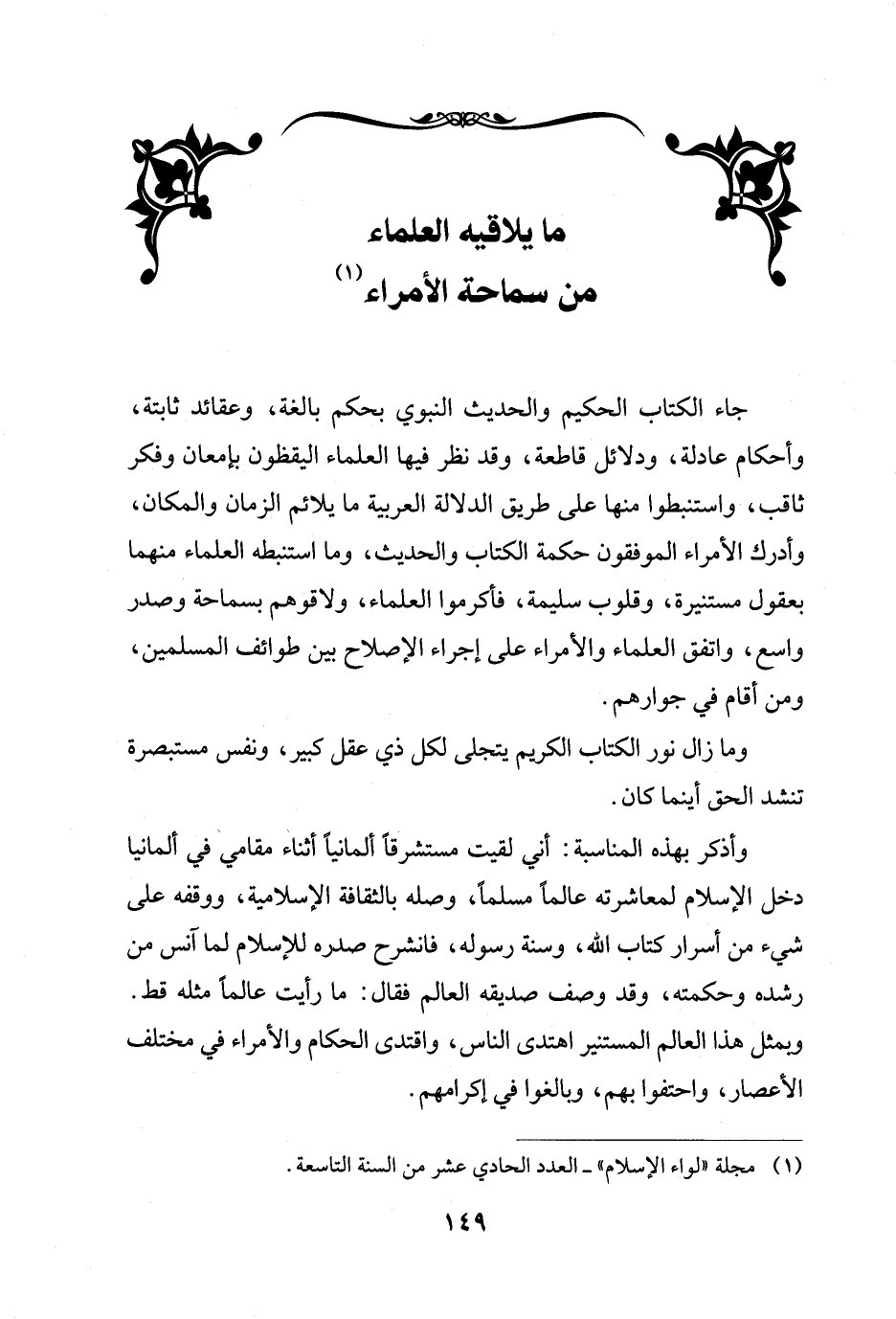 وأذكر بهذه المناسبة: أني لقيت مستشرقاً ألمانياً أثناء مقامي في ألمانيا دخل الإسلام لمعاشرته عالماً مسلماً، وصله بالثقافة الإسلامية، ووقفه على شيء من أسرار كتاب الله، وسنة رسوله، فانشرح صدره للإسلام لما آنس من رشده وحكمته، وقد وصف صديقه العالم فقال: ما رأيت عالما مثله قط. وبمثل هذا العالم المستنير اهتدى الناس، واقتدى الحكام والأمراء في مختلف الأعصار، واحتفوا بهم، وبالغوا في إكرامهم.