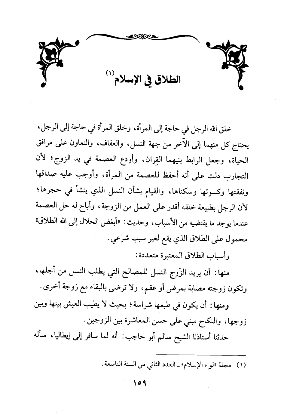 خلق الله الرجل في حاجة إلى المرأة، وخلق المرأة في حاجة إلى الرجل، يحتاج كل منهما إلى الآخر من جهة النسل، والعفاف، والتعاون على مرافق الحياة، وجعل الرابط بنيهما القِران، وأودع العصمة في يد الزوج؛ لأن التجارب دلت على أنه أحفظ للعصمة من المرأة، وأوجب عليه صداقها ونفقتها وكسوتها وسكناها، والقيام بشأن النسل الذي ينشأ في حجرها؛ لأن الرجل بطبيعة خلقه أقدر على العمل من الزوجة، وأباح له حل العصمة عندما يوجد ما يقتضيه من الأسباب، وحديث: "أبغض الحلال إلى الله الطلاق" محمول على الطلاق الذي يقع لغير سبب شرعي.
