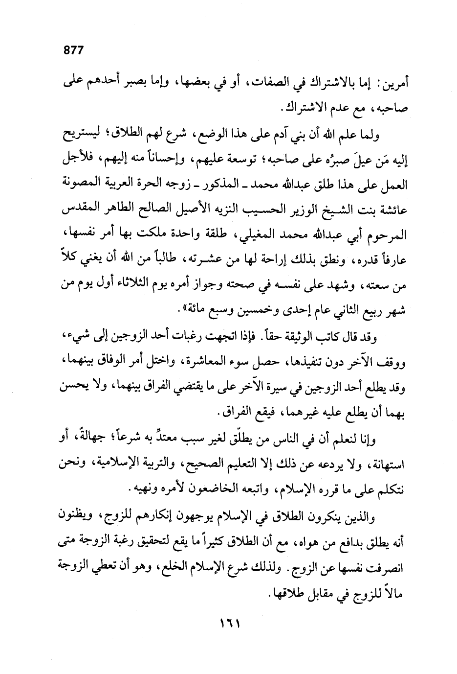 وقد قال كاتب الوثيقة حقاً. فإذا اتجهت رغبات أحد الزوجين إلى شيء، ووقف الآخر دون تنفيذها، حصل سوء المعاشرة، واختل أمر الوفاق بينهما، وقد يطلع أحد الزوجين في سيرة الآخر على ما يقتضي الفراق بينهما، ولا يحسن بهما أن يطلع عليه غيرهما، فيقع الفراق.