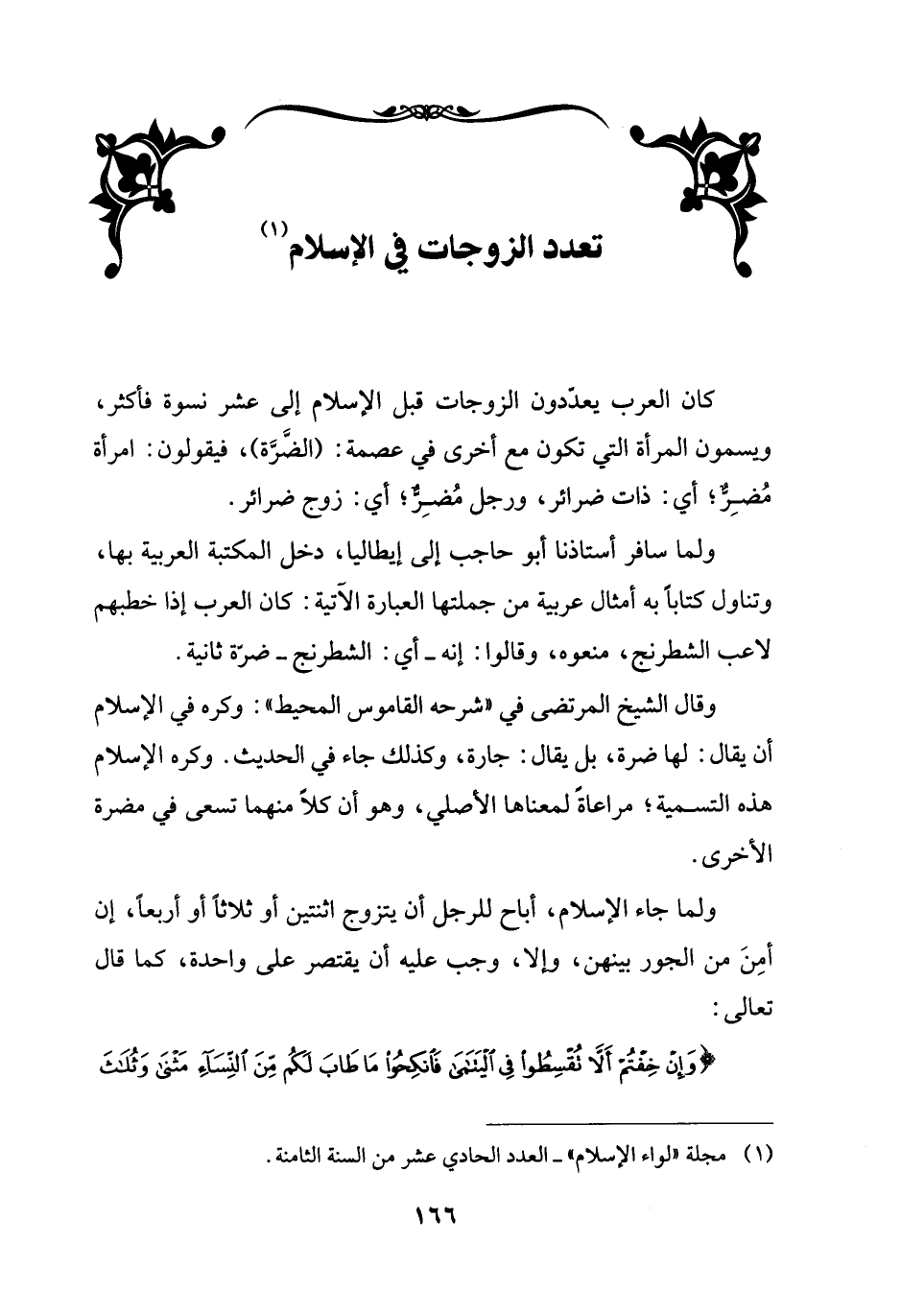 ولما جاء الإسلام، أباح للرجل أن يتزوج اثنتين أو ثلاثاً أو أربعاً، إن أمِنَ من الجور بينهن، وإلا، وجب عليه أن يقتصر على واحدة، كما قال تعالى: