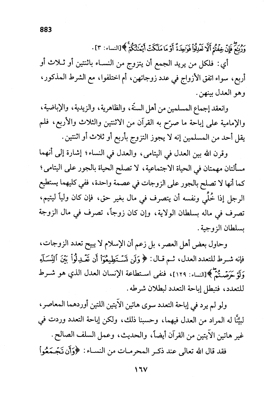 ولو لم يرد في إباحة التعدد سوى هاتين الآيتين اللتين أوردهما المعاصر، لبيَّنَّا له المراد من العدل فيهما، وحسبنا ذلك، ولكن إباحة التعدد وردت في غير هاتين الآيتين من القرآن أيضاً، والحديث، وعمل السلف الصالح.