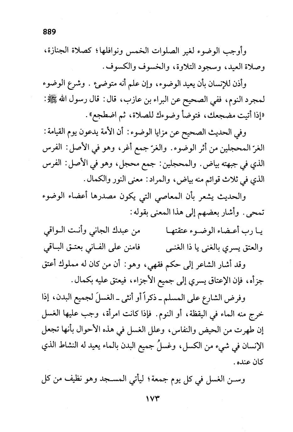 وفرض الشارع على المسلم - ذكراً أو أنثى - الغسلَ لجميع البدن، إذا خرج منه الماء في اليقظة، أو النوم. فإذا كانت امرأة، وجب عليها الغسل إن طهرت من الحيض والنفاس، وعلل الغسل في هذه الأحوال بأنها تجعل الإنسان في شيء من الكسل، وغسلُ جميع البدن بالماء يعيد له النشاط الذي كان عنده.