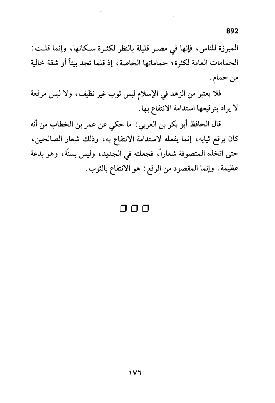 قال الحافظ أبو بكر بن العربي: ما حكي عن عمر بن الخطاب من أنه كان يرقع ثيابه، إنما يفعله لاستدامة الانتفاع به، وذلك شعار الصالحين، حتى اتخذه المتصوفة شعاراً، فجعلته في الجديد، وليس بسنّة، وهو بدعة عظيمة. وإنما المقصود من الرقع: هو الانتفاع بالثوب.