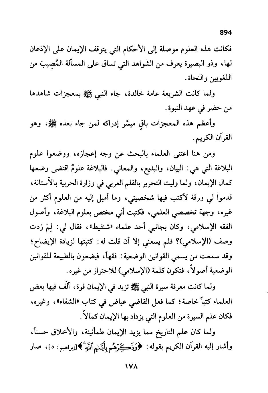 ومن هنا اعتنى العلماء بالبحث عن وجه إعجازه، ووضعوا علوم البلاغة التي هي: البيان، والبديع، والمعاني. فالبلاغة علومٌ اقتضى وضعها كمال الإيمان، ولما وليت التحرير بالقلم العربي في وزارة الحربية بالآستانة، قدموا لي ورقة لأكتب فيها شخصيتي، وما أميل إليه من العلوم أكثر من غيره، وجهة تخصصي العلمي، فكتبت أني مختص بعلوم البلاغة، وأصول الفقه الإسلامي، وكان بجانبي أحد علماء "شنقيط"، فقال لي: لِمَ زدت وصف (الإسلامي)؟ فلم يسعني إلا أن قلت له: كتبتها لزيادة الإيضاح؛ وقد سمعت من يسمي القوانين الوضعية: فقها، فيضعون بالطبيعة للقوانين الوضعية أصولاً، فتكون كلمة (الإسلامي) للاحتراز من غيره.