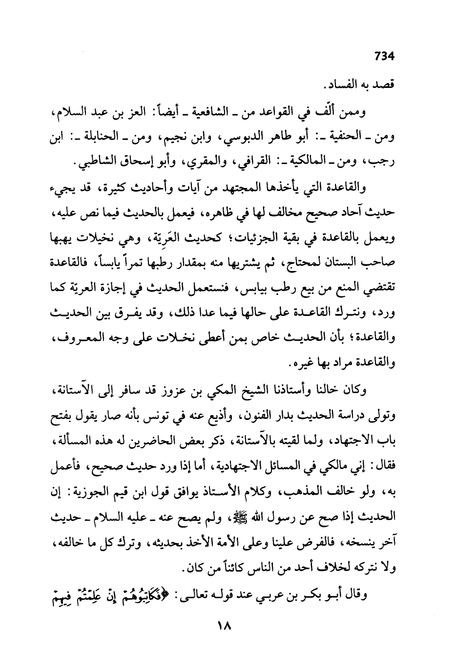 وكان خالنا وأستاذنا الشيخ المكي بن عزوز قد سافر إلى الآستانة، وتولى دراسة الحديث بدار الفنون، وأذيع عنه في تونس بأنه صار يقول بفتح باب الاجتهاد، ولما لقيته بالآستانة، ذكر بعض الحاضرين له هذه المسألة، فقال: إني مالكي في المسائل الاجتهادية، أما إذا ورد حديث صحيح، فأعمل به، ولو خالف المذهب، وكلام الأستاذ يوافق قول ابن قيم الجوزية: إن الحديث إذا صح عن رسول الله - صلى الله عليه وسلم -، ولم يصح عنه - عليه السلام - حديث آخر ينسخه، فالفرض علينا وعلى الأمة الأخذ بحديثه، وترك كل ما خالفه، ولا نتركه لخلاف أحد من الناس كائناً من كان.