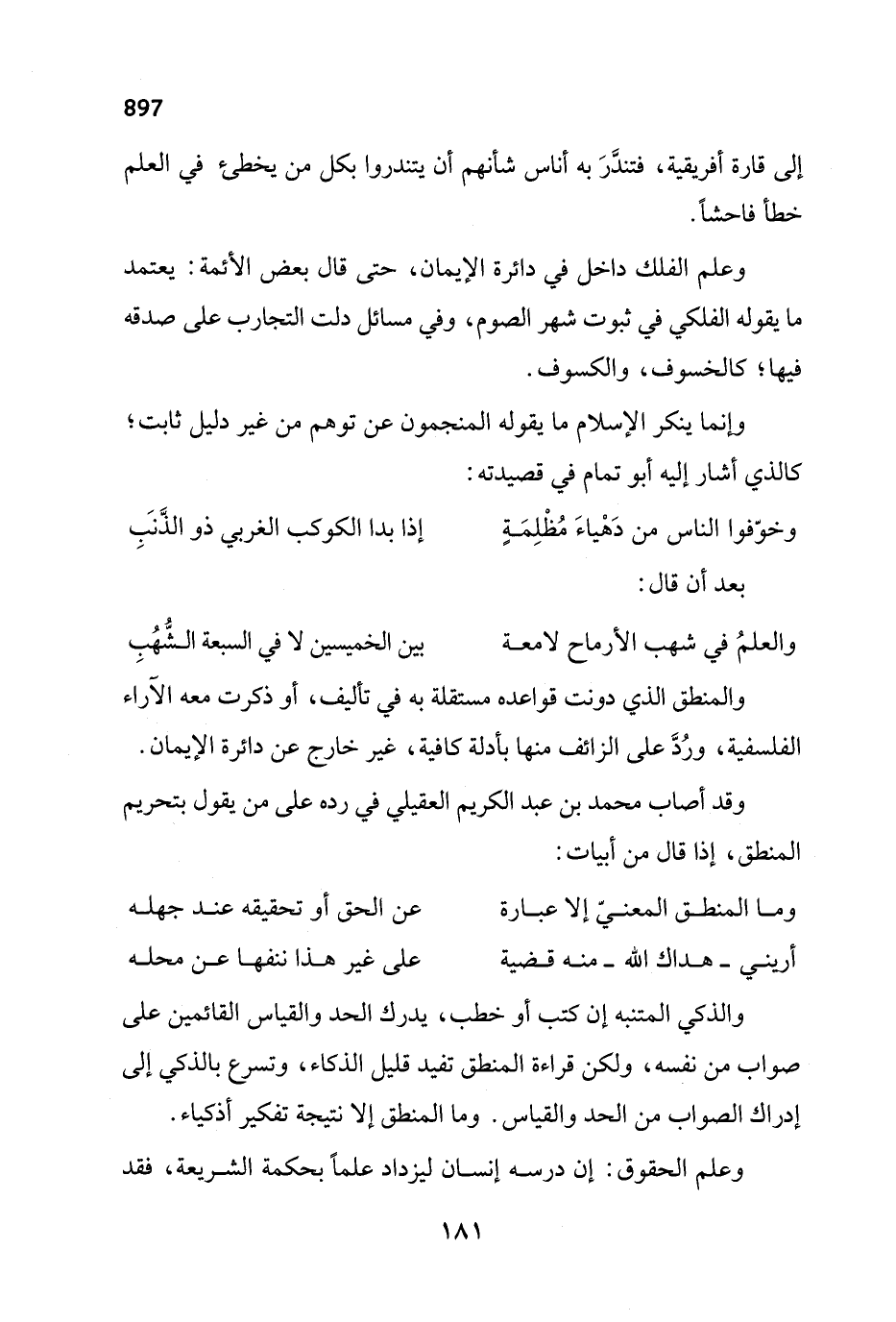 وقد أصاب محمد بن عبد الكريم العقيلي في رده على من يقول بتحريم المنطق، إذا قال من أبيات: