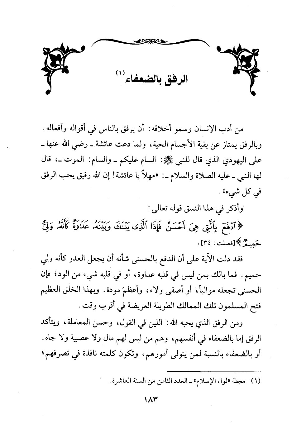من أدب الإنسان وسمو أخلاقه: أن يرفق بالناس في أقواله وأفعاله. وبالرفق يمتاز عن بقية الأجسام الحية، ولما دعت عائشة - رضي الله عنها - على اليهودي الذي قال للنبي - صلى الله عليه وسلم -: السام عليكم - والسام: الموت -، قال لها النبي - عليه الصلاة والسلام -: "مهلاً يا عائشة! إن الله رفيق يحب الرفق في كل شيء".