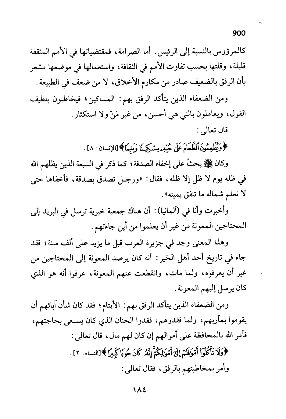 كالمرؤوس بالنسبة إلى الرئيس. أما الصرامة، فمقتضياتها في الأمم المثقفة قليلة، وقلتها بحسب تفاوت الأمم في الثقافة، واستعمالها في موضعها مشعر بأن الرفق بالضعيف صادر من مكارم الأخلاق، لا من ضعف في الطبيعة.
