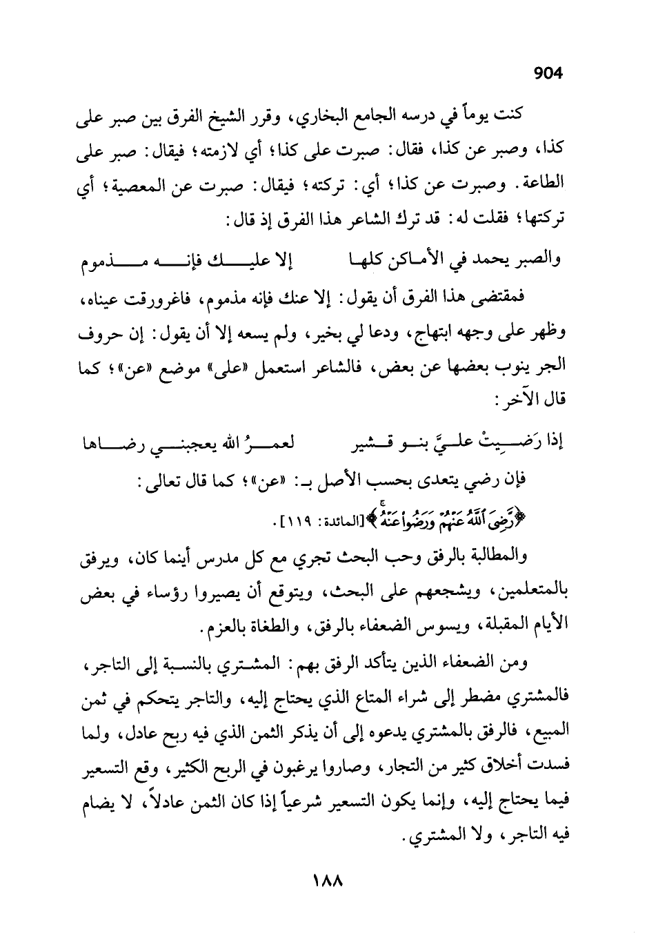 كنت يوماً في درسه الجامع البخاري، وقرر الشيخ الفرق بين صبر على كذا، وصبر عن كذا، فقال: صبرت على كذا؛ أي لازمته؛ فيقال: صبر على الطاعة. وصبرت عن كذا؛ أي: تركته؛ فيقال: صبرت عن المعصية؛ أي تركتها؛ فقلت له: قد ترك الشاعر هذا الفرق إذ قال: