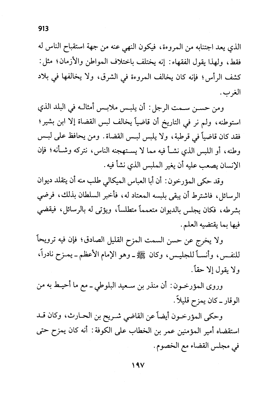 ومن حسن سمت الرجل: أن يلبس ملابس أمثاله في البلد الذي استوطنه، ولم نر في التاريخ أن قاضياً يخالف لبس القضاة إلا ابن بشير؛ فقد كان قاضياً في قرطبة، ولا يلبس لبس القضاة. ومن يحافظ على لبس وطنه، أو اللبس الذي نشأ فيه مما لا يستهجنه الناس، نتركه وشأنه؛ فإن الإنسان يصعب عليه أن يغير الملبس الذي نشأ فيه.