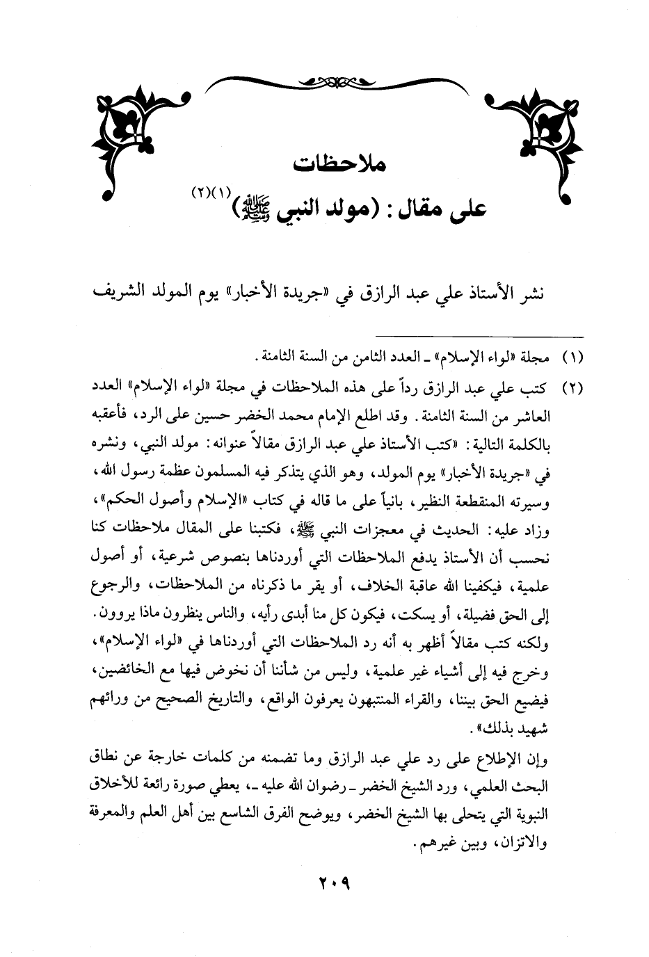 (¬2) كتب علي عبد الرازق ردًا على هذه الملاحظات في مجلة "لواء الإسلام" العدد العاشر من السنة الثامنة. وقد اطلع الإمام محمد الخضر حسين على الرد، فأعقبه بالكلمة التالية: "كتب الأستاذ علي عبد الرازق مقالًا عنوانه: مولد النبي، ونشره في "جريدة الأخبار" يوم المولد، وهو الذي يتذكر فيه المسلمون عظمة رسول الله، وسيرته المنقطعة النظير، بانيًا على ما قاله في كتاب "الإسلام وأصول الحكم"، وزاد عليه: الحديث في معجزات النبي - صلى الله عليه وسلم -، فكتبنا على المقال ملاحظات كنا نحسب أن الأستاذ يدفع الملاحظات التي أوردناها بنصوص شرعية، أو أصول علمية، فيكفينا الله عاقبة الخلاف، أو يقر ما ذكرناه من الملاحظات، والرجوع إلى الحق فضيلة، أو يسكت، فيكون كل منا أبدى رأيه، والناس ينظرون ماذا يروون. ولكنه كتب مقالًا أظهر به أنه رد الملاحظات التي أوردناها في "لواء الإسلام"، وخرج فيه إلى أشياء غير علمية، وليس من شأننا أن نخوض فيها مع الخائضين، فيضيع الحق بيننا، والقراء المنتبهون يعرفون الواقع، والتاريخ الصحيح من ورائهم شهيد بذلك".