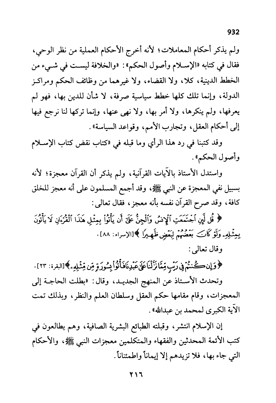 واستدل الأستاذ بالآيات القرآنية، ولم يذكر أن القرآن معجزة؛ لأنه بسبيل نفي المعجزة عن النبي - صلى الله عليه وسلم -، وقد أجمع المسلمون على أنه معجز للخلق كافة، وقد صرح القرآن نفسه بأنه معجز، فقال تعالى: