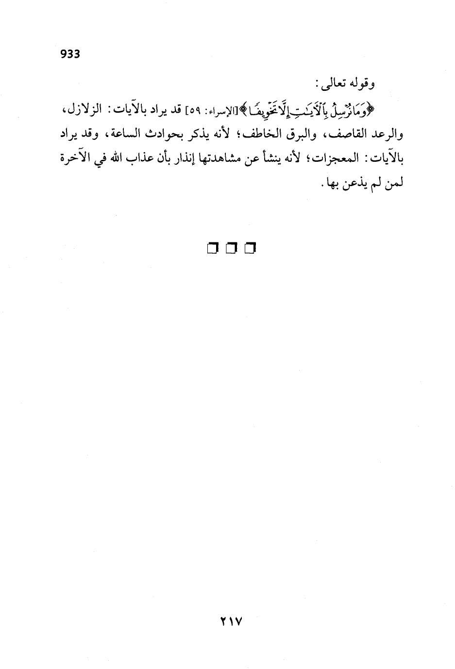 {وَمَا نُرْسِلُ بِالْآيَاتِ إِلَّا تَخْوِيفًا} [الإسراء: 59] قد يراد بالآيات: الزلازل، والرعد القاصف، والبرق الخاطف؛ لأنه يذكر بحوادث الساعة، وقد يراد بالآيات: المعجزات؛ لأنه ينشأ عن مشاهدتها إنذار بأن عذاب الله في الآخرة لمن لم يذعن بها.