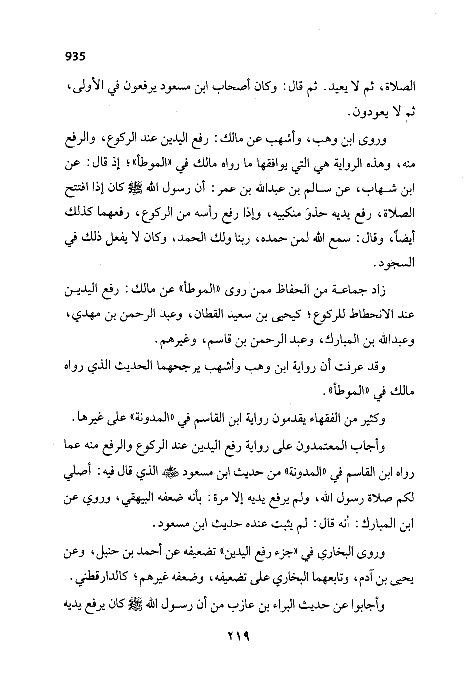 وأجاب المعتمدون على رواية رفع اليدين عند الركوع والرفع منه عما رواه ابن القاسم في "المدونة" من حديث ابن مسعود - رضي الله عنه - الذي قال فيه: أصلي لكم صلاة رسول الله، ولم يرفع يديه إلا مرة: بأنه ضعفه البيهقي، وروي عن ابن المبارك: أنه قال: لم يثبت عنده حديث ابن مسعود.