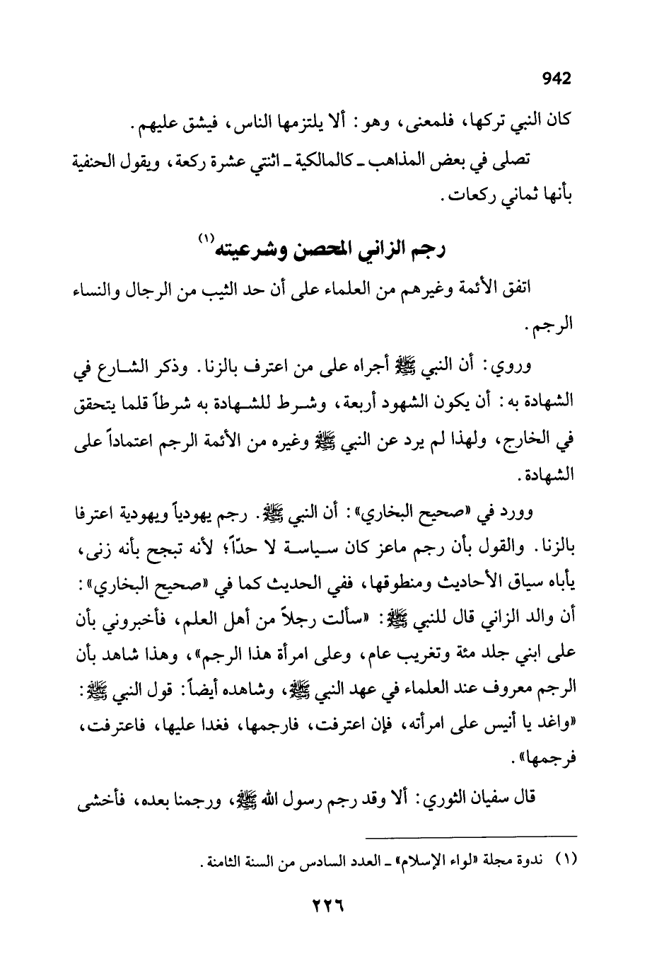 وروي: أن النبي - صلى الله عليه وسلم - أجراه على من اعترف بالزنا. وذكر الشارع في الشهادة به: أن يكون الشهود أربعة، وشرط للشهادة به شرطاً قلما يتحقق في الخارج، ولهذا لم يرد عن النبي - صلى الله عليه وسلم - وغيره من الأئمة الرجم اعتماداً على الشهادة.