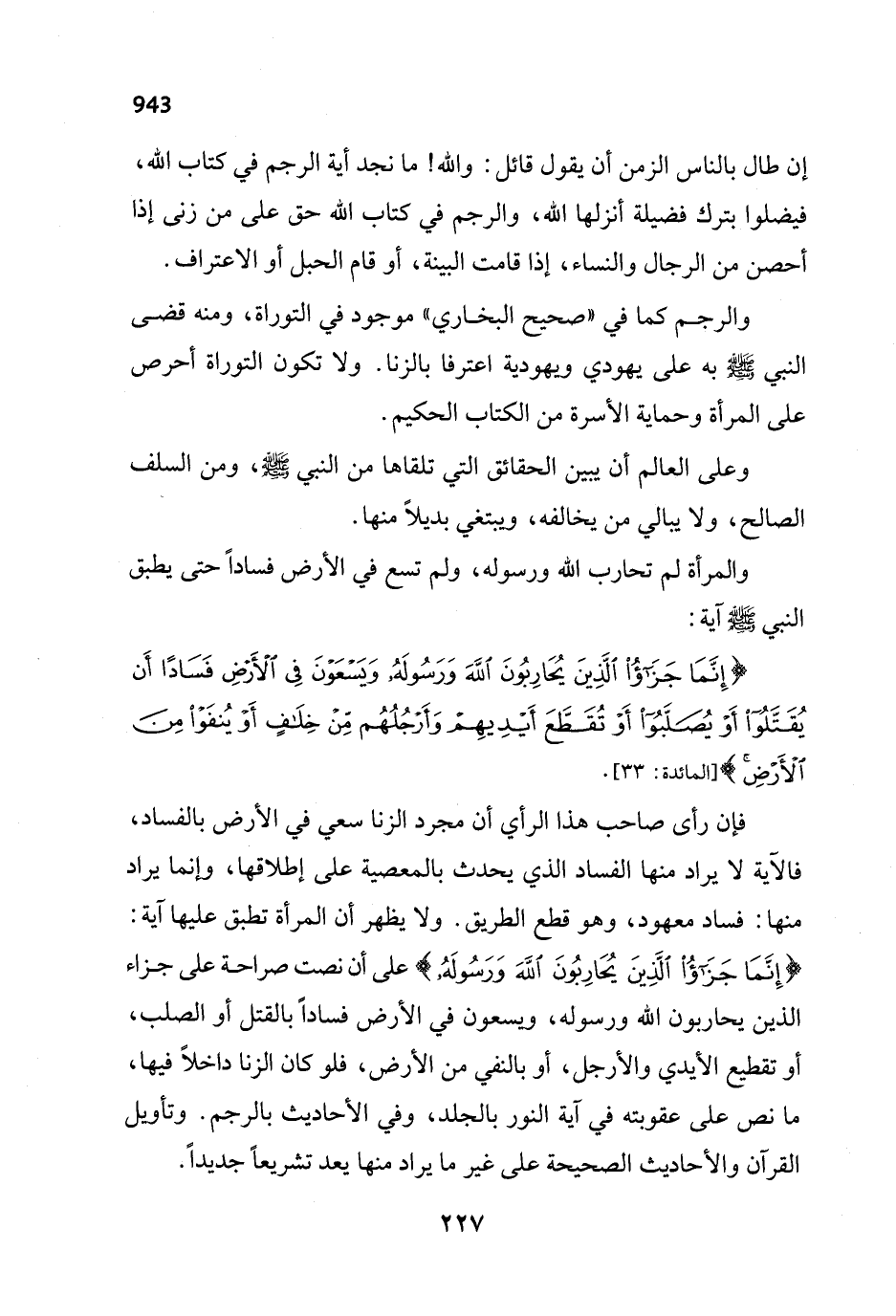 فإن رأى صاحب هذا الرأي أن مجرد الزنا سعي في الأرض بالفساد، فالآية لا يراد منها الفساد الذي يحدث بالمعصية على إطلاقها، وإنما يراد منها: فساد معهود، وهو قطع الطريق. ولا يظهر أن المرأة تطبق عليها آية: {إِنَّمَا جَزَاءُ الَّذِينَ يُحَارِبُونَ اللَّهَ وَرَسُولَهُ} على أن نصت صراحة على جزاء الذين يحاربون الله ورسوله، ويسعون في الأرض فساداً بالقتل أو الصلب، أو تقطيع الأيدي والأرجل، أو بالنفي من الأرض، فلو كان الزنا داخلاً فيها، ما نص على عقوبته في آية النور بالجلد، وفي الأحاديث بالرجم. وتأويل القرآن والأحاديث الصحيحة على غير ما يراد منها يعد تشريعاً جديداً.