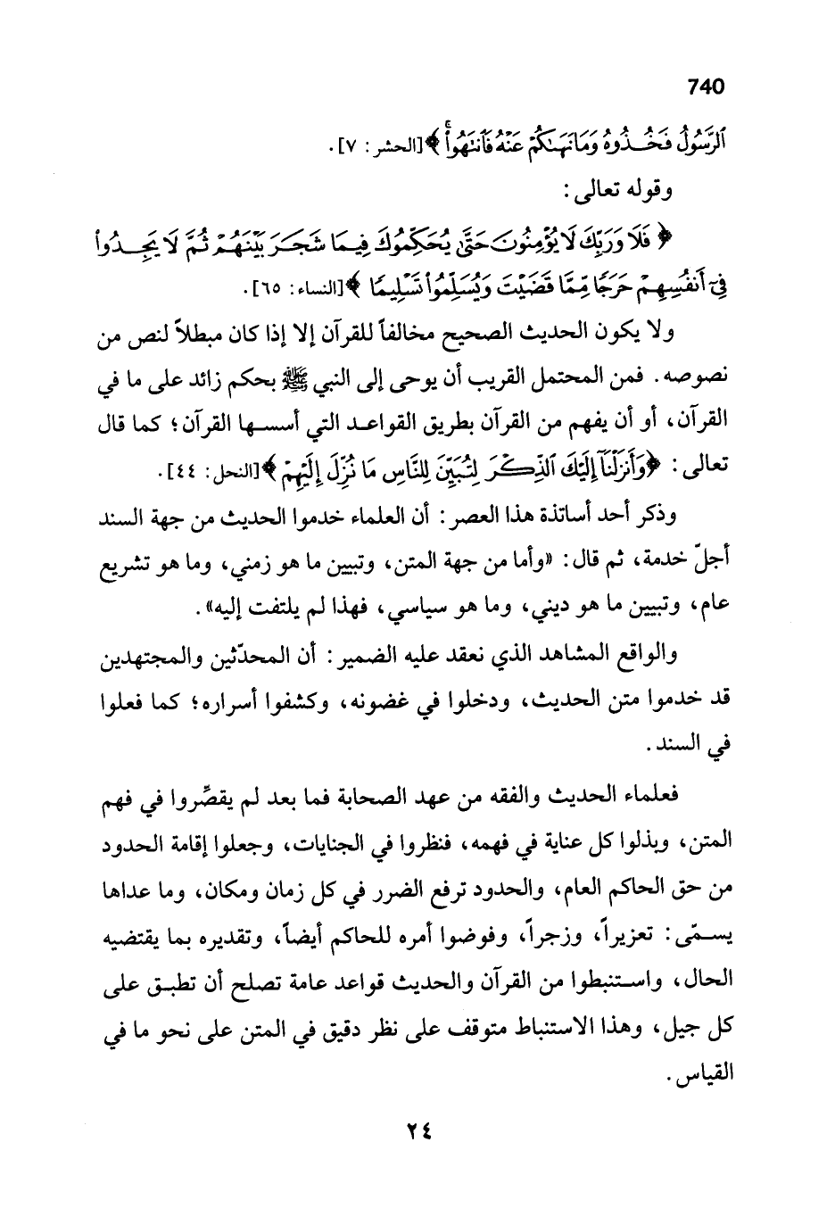 فعلماء الحديث والفقه من عهد الصحابة فما بعد لم يقصِّروا في فهم المتن، وبذلوا كل عناية في فهمه، فنظروا في الجنايات، وجعلوا إقامة الحدود من حق الحاكم العام، والحدود ترفع الضرر في كل زمان ومكان، وما عداها يسمّى: تعزيراً، وزجراً، وفوضوا أمره للحاكم أيضاً، وتقديره بما يقتضيه الحال، واستنبطوا من القرآن والحديث قواعد عامة تصلح أن تطبق على كل جيل، وهذا الاستنباط متوقف على نظر دقيق في المتن على نحو ما في القياس.