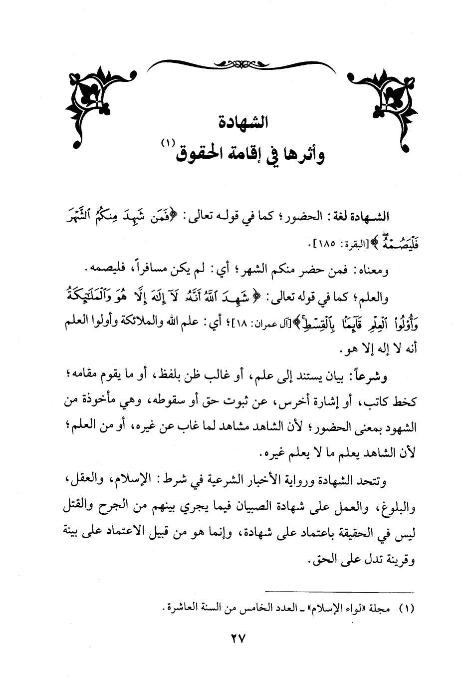 الشهادة لغة: الحضور؛ كما في قوله تعالى: {فَمَنْ شَهِدَ مِنْكُمُ الشَّهْرَ فَلْيَصُمْهُ} [البقرة: 185].