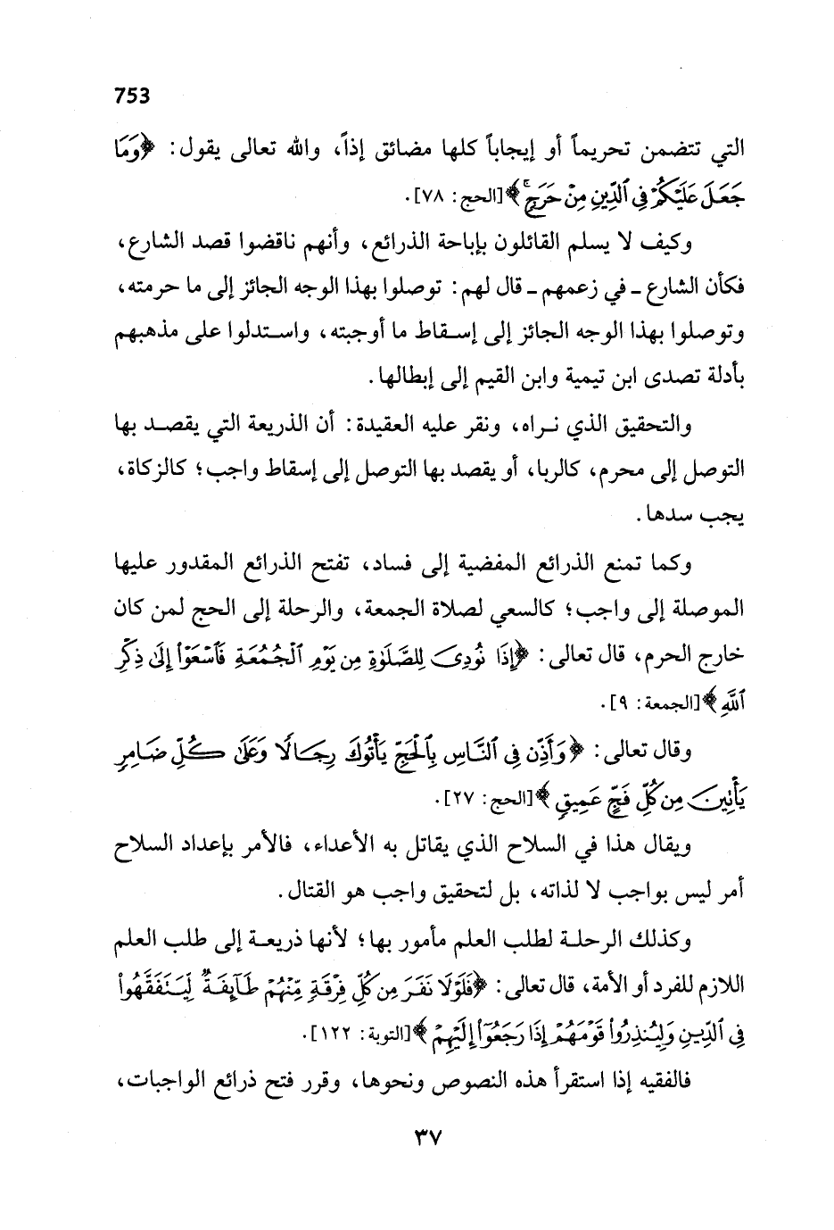وكما تمنع الذرائع المفضية إلى فساد، تفتح الذرائع المقدور عليها الموصلة إلى واجب؛ كالسعي لصلاة الجمعة، والرحلة إلى الحج لمن كان خارج الحرم، قال تعالى: {إِذَا نُودِيَ لِلصَّلَاةِ مِنْ يَوْمِ الْجُمُعَةِ فَاسْعَوْا إِلَى ذِكْرِ} [الجمعة: 9].