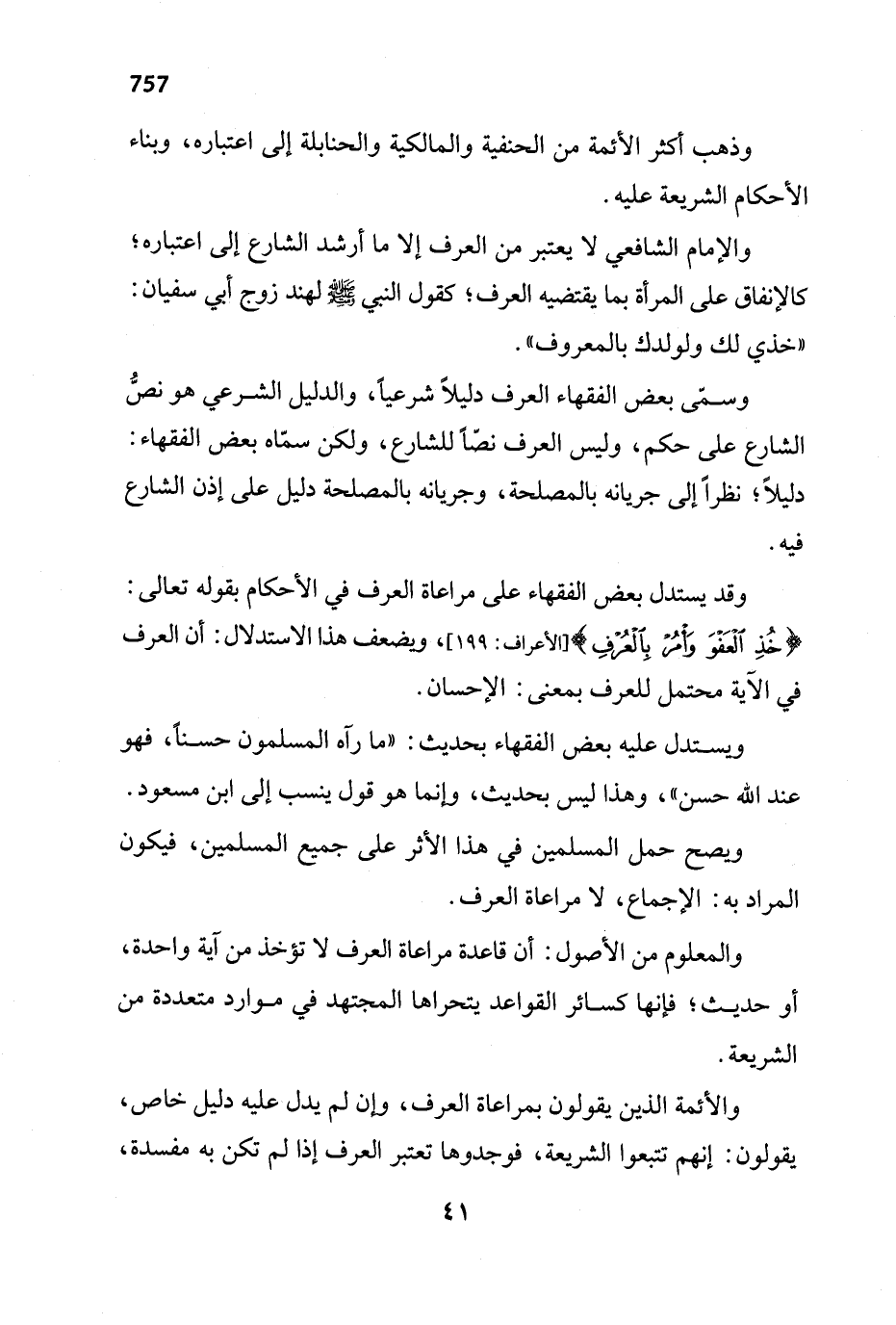 والمعلوم من الأصول: أن قاعدة مراعاة العرف لا تؤخذ من آية واحدة، أو حديث؛ فإنها كسائر القواعد يتحراها المجتهد في موارد متعددة من الشريعة.
