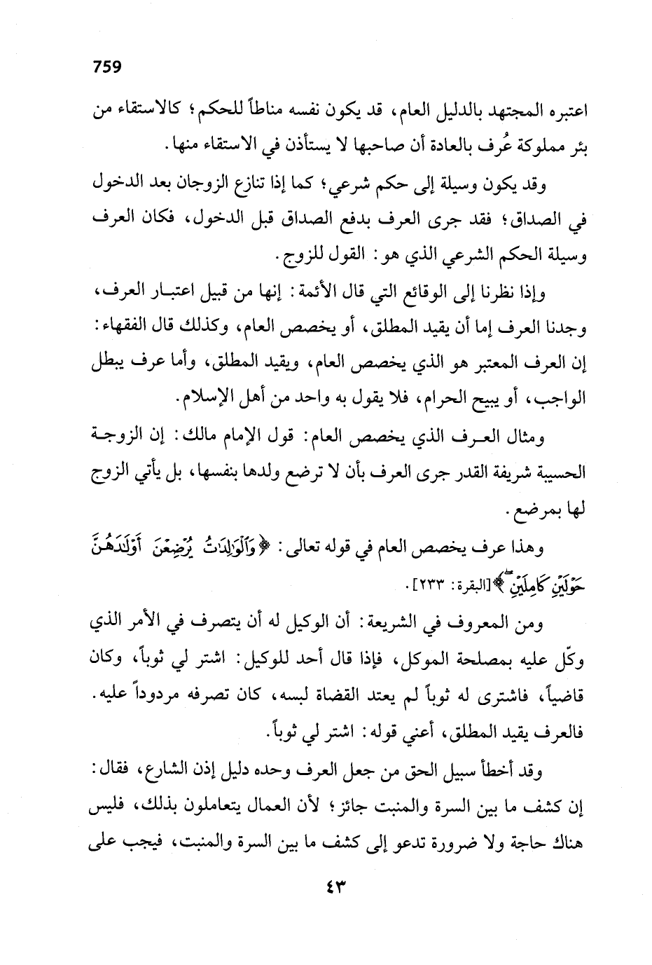 وإذا نظرنا إلى الوقاع التي قال الأئمة: إنها من قبيل اعتبار العرف، وجدنا العرف إما أن يقيد المطلق، أو يخصص العام، وكذلك قال الفقهاء: إن العرف المعتبر هو الذي يخصص العام، ويقيد المطلق، وأما عرف يبطل الواجب، أو يبيح الحرام، فلا يقول به واحد من أهل الإِسلام.