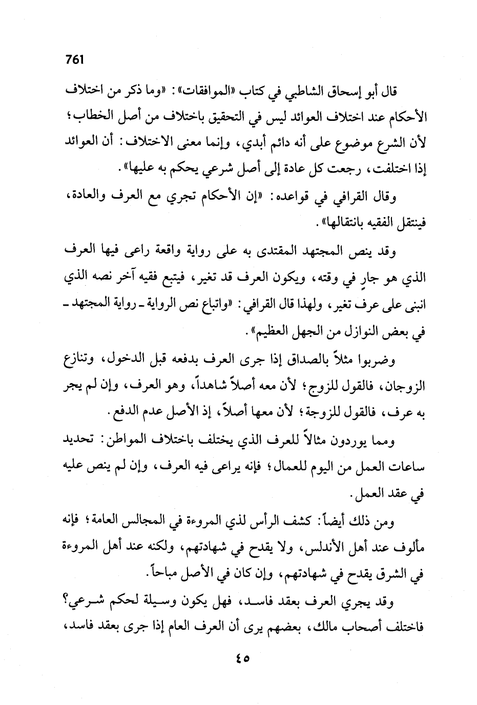 قال أبو إسحاق الشاطبي في كتاب "الموافقات": "وما ذكر من اختلاف الأحكام عند اختلاف العوائد ليس في التحقيق باختلاف من أصل الخطاب؛ لأن الشرع موضوع على أنه دائم أبدي، وإنما معنى الاختلاف: أن العوائد إذا اختلفت، رجعت كل عادة إلى أصل شرعي يحكم به عليها".
