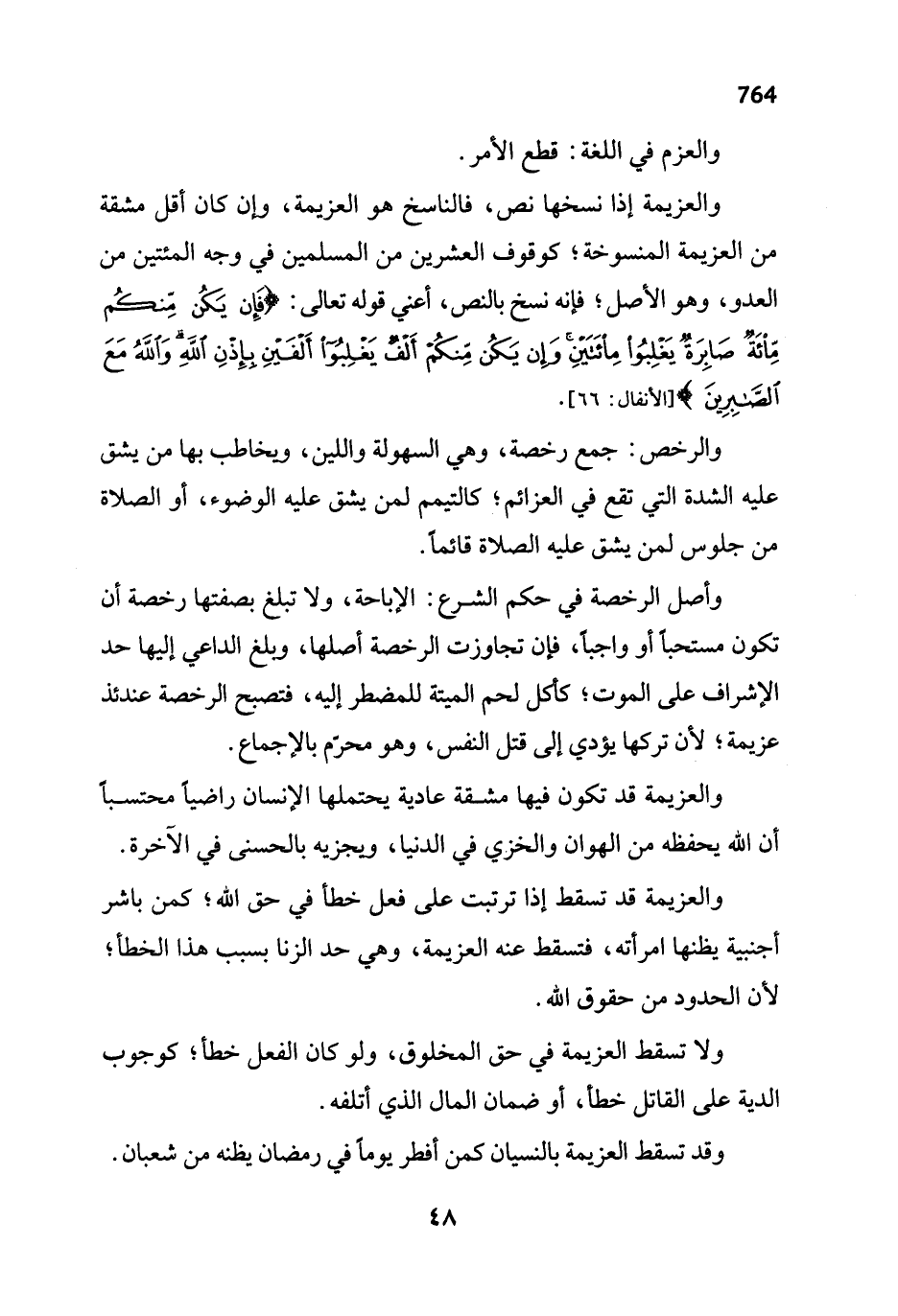 والعزيمة إذا نسخها نص، فالناسخ هو العزيمة، وإن كان أقل مشقة من العزيمة المنسوخة؛ كوقوف العشرين من المسلمين في وجه المئتين من العدو، وهو الأصل؛ فإنه نسخ بالنص، أعني قوله تعالى: {فَإِنْ يَكُنْ مِنْكُمْ مِائَةٌ صَابِرَةٌ يَغْلِبُوا مِائَتَيْنِ وَإِنْ يَكُنْ مِنْكُمْ أَلْفٌ يَغْلِبُوا أَلْفَيْنِ بِإِذْنِ اللَّهِ وَاللَّهُ مَعَ الصَّابِرِينَ} [الأنفال: 66].