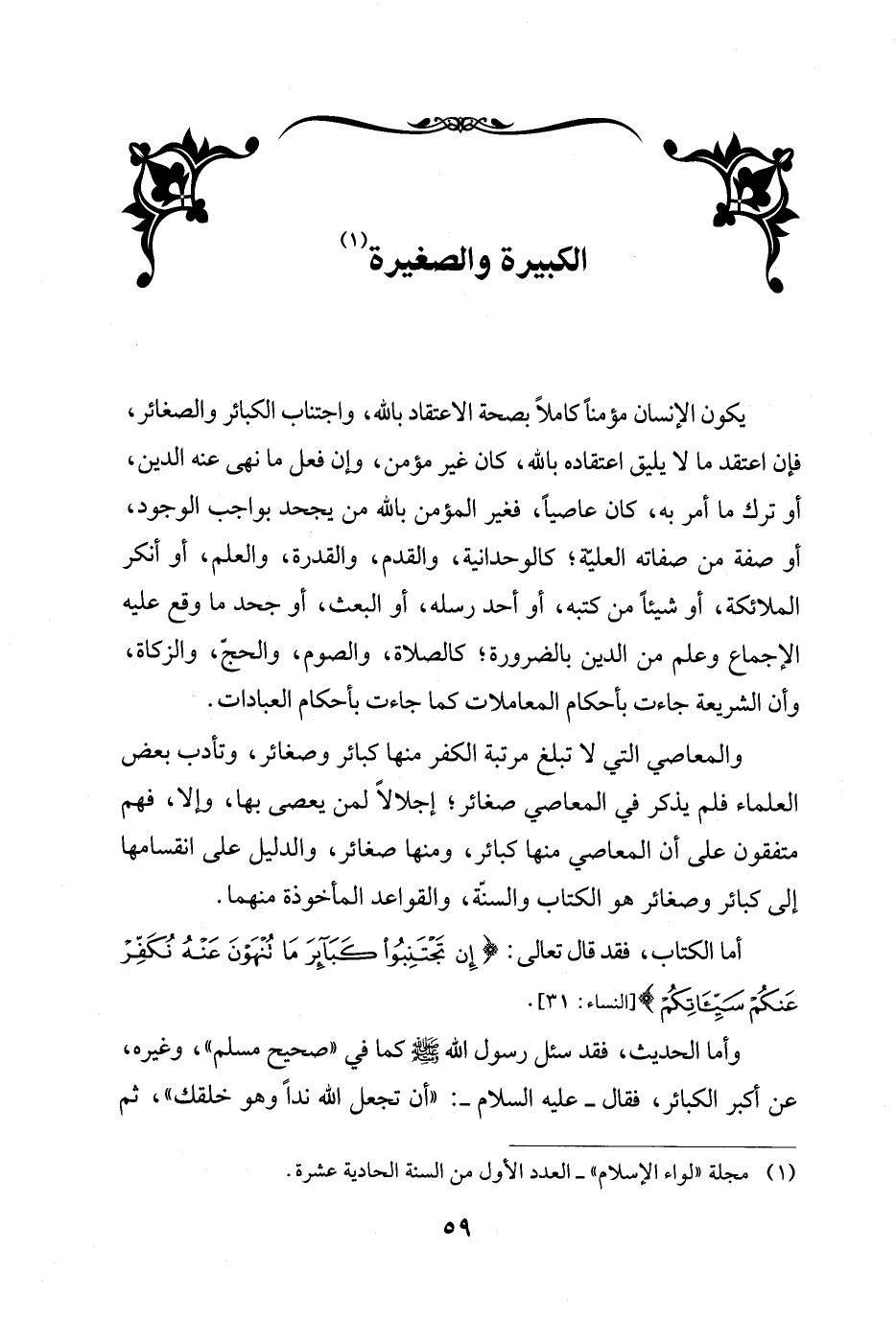 والمعاصي التي لا تبلغ مرتبة الكفر منها كبائر وصغائر، وتأدب بعض العلماء فلم يذكر في المعاصي صغائر؛ إجلالاً لمن يعصى بها، وإلا، فهم متفقون على أن المعاصي منها كبائر، ومنها صغائر، والدليل على انقسامها إلى كبائر وصغائر هو الكتاب والسنّة، والقواعد المأخوذة منهما.