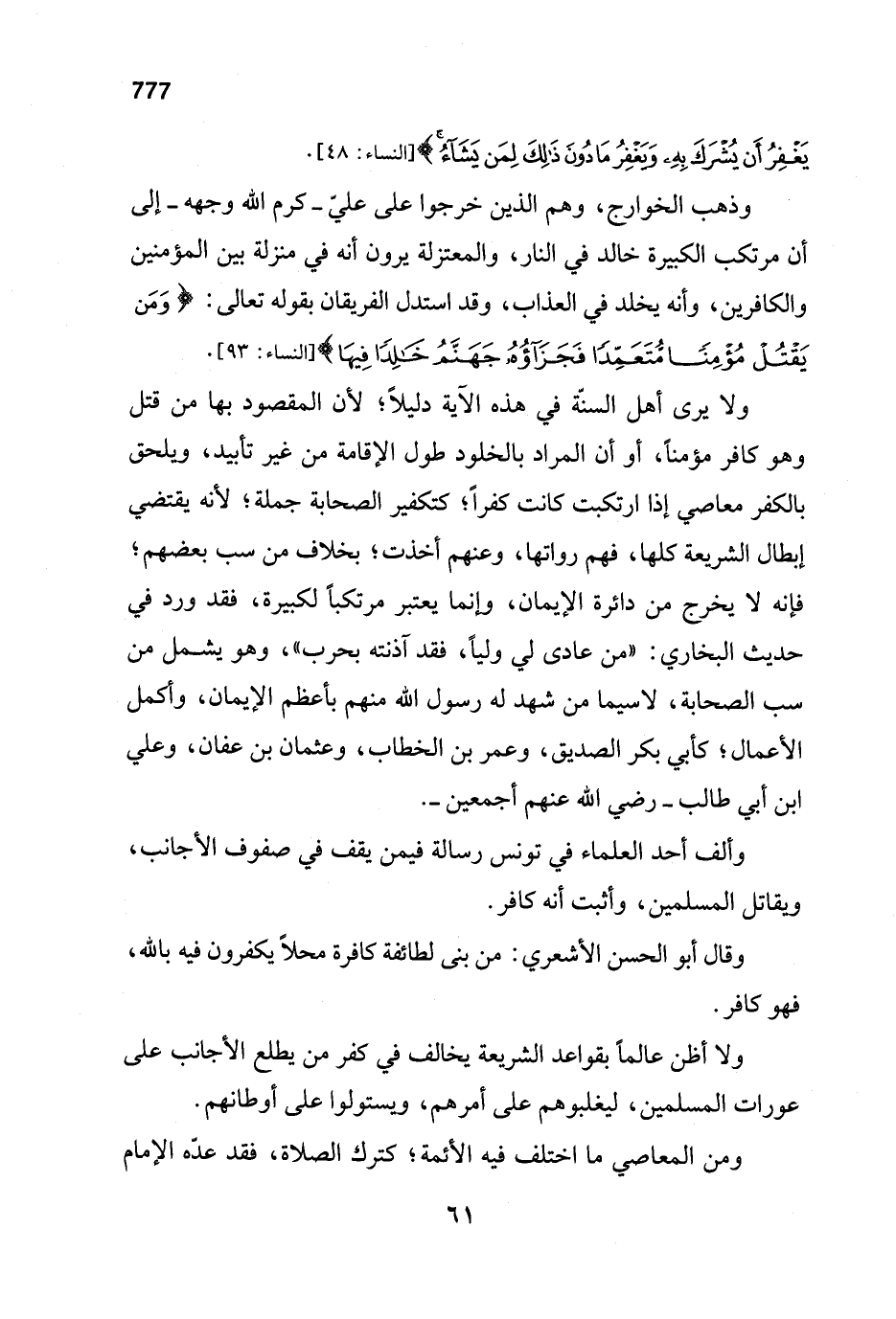 ولا يرى أهل السنّة في هذه الآية دليلاً؛ لأن المقصود بها من قتل وهو كافر مؤمناً، أو أن المراد بالخلود طول الإقامة من غير تأبيد، ويلحق بالكفر معاصي إذا ارتكبت كانت كفراً؛ كتكفير الصحابة جملة؛ لأنه يقتضي إبطال الشريعة كلها، فهم رواتها، وعنهم أخذت؛ بخلاف من سب بعضهم؛ فإنه لا يخرج من دائرة الإيمان، وإنما يعتبر مرتكباً لكبيرة، فقد ورد في حديث البخاري: "من عادى لي ولياً، فقد آذنته بحرب"، وهو يشمل من سب الصحابة، لاسيما من شهد له رسول الله منهم بأعظم الإيمان، وأكمل الأعمال؛ كأبي بكر الصديق، وعمر بن الخطاب، وعثمان بن عفان، وعلي ابن أبي طالب - رضي الله عنهم أجمعين -.