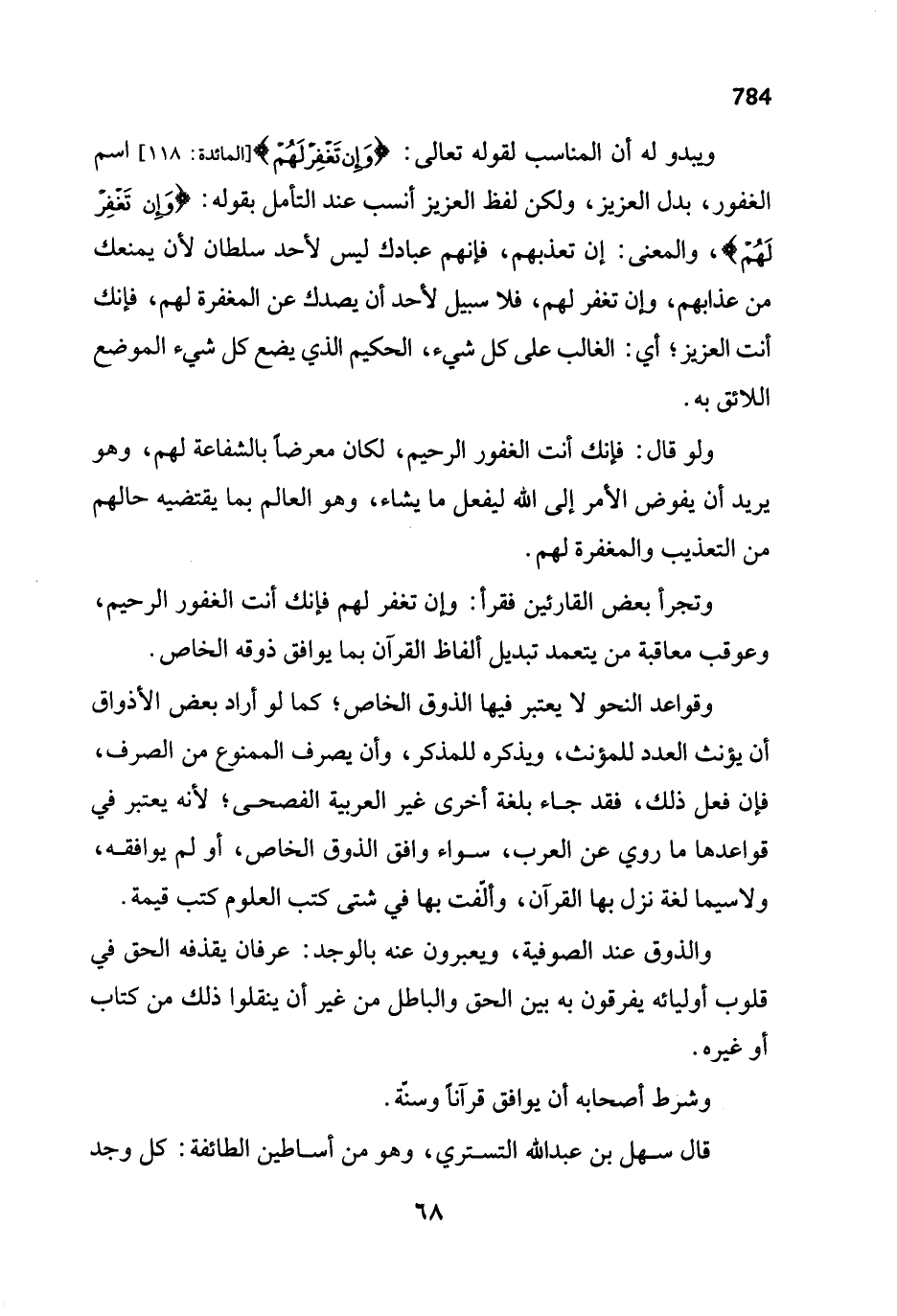 ويبدو له أن المناسب لقوله تعالى: {وَإِنْ تَغْفِرْ لَهُمْ} [المائدة: 118] اسم الغفور، بدل العزيز، ولكن لفظ العزيز أنسب عند التأمل بقوله: {وَإِنْ تَغْفِرْ لَهُمْ}، والمعنى: إن تعذبهم، فإنهم عبادك ليس لأحد سلطان لأن يمنعك من عذابهم، وإن تغفر لهم، فلا سبيل لأحد أن يصدك عن المغفرة لهم، فإنك أنت العزيز؛ أي: الغالب على كل شيء، الحكيم الذي يضع كل شيء الموضع اللائق به.