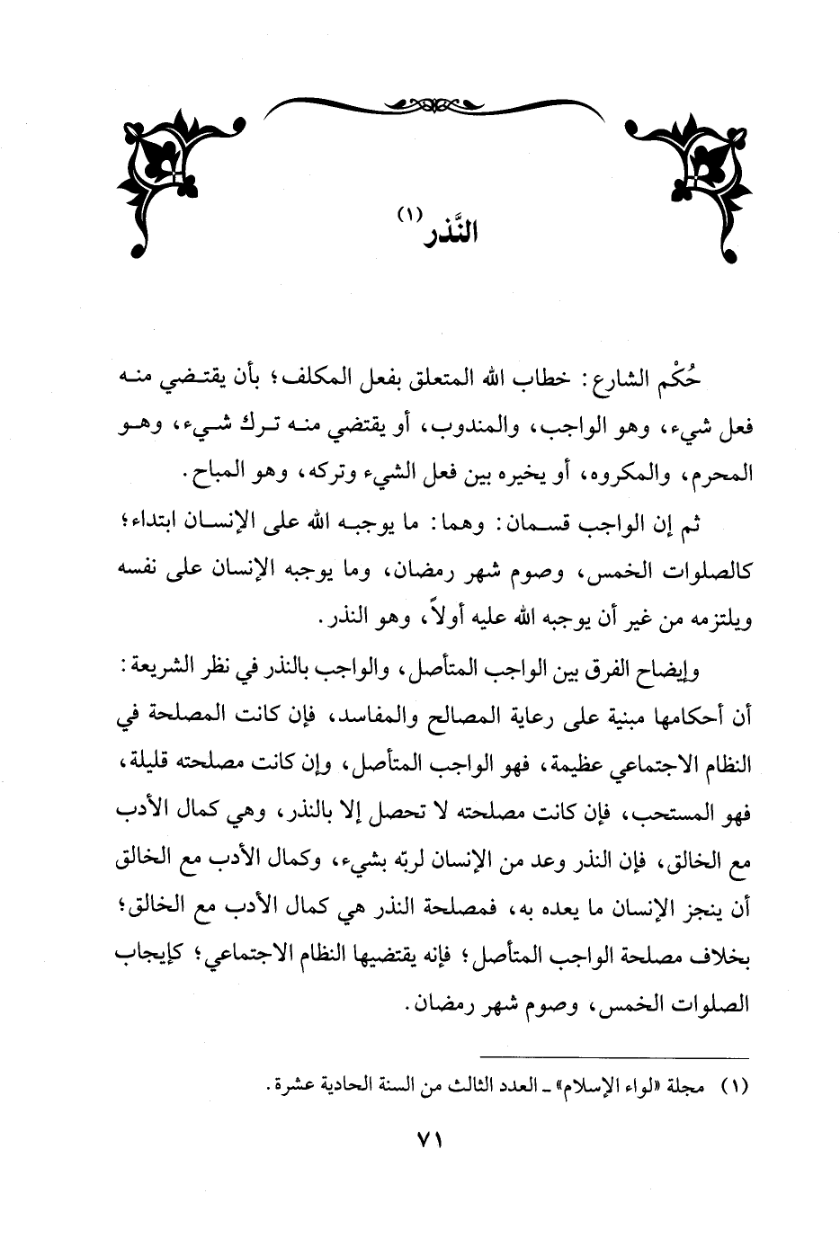 وإيضاح الفرق بين الواجب المتأصل، والواجب بالنذر في نظر الشريعة: أن أحكامها مبنية على رعاية المصالح والمفاسد، فإن كانت المصلحة في النظام الاجتماعي عظيمة، فهو الواجب المتأصل، وإن كانت مصلحته قليلة، فهو المستحب، فإن كانت مصلحته لا تحصل إلا بالنذر، وهي كمال الأدب مع الخالق، فإن النذر وعد من الإنسان لربّه بشيء، وكمال الأدب مع الخالق أن ينجز الإنسان ما يعده به، فمصلحة النذر هي كمال الأدب مع الخالق، بخلاف مصلحة الواجب المتاصل؛ فإنه يقتضيها النظام الاجتماعي؛ كإيجاب الصلوات الخمس، وصوم شهر رمضان.