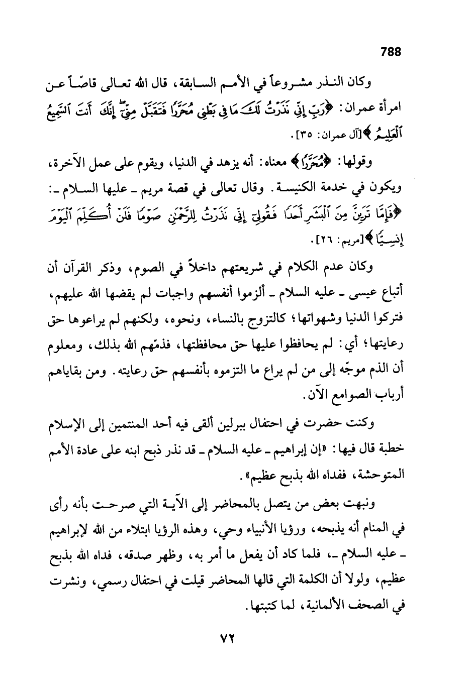 وكنت حضرت في احتفال ببرلين ألقى فيه أحد المنتمين إلى الإسلام خطبة قال فيها: "إن إبراهيم - عليه السلام - قد نذر ذبح ابنه على عادة الأمم المتوحشة، ففداه الله بذبح عظيم".