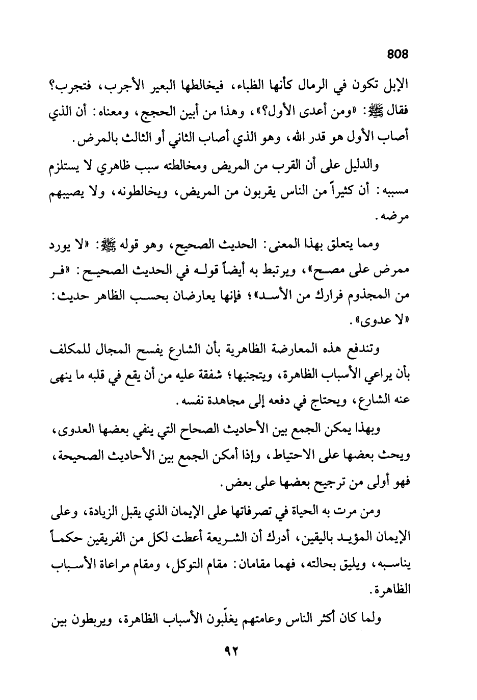 ومما يتعلق بهذا المعنى: الحديث الصحيح، وهو قوله - صلى الله عليه وسلم -: "لا يورد ممرض على مصح"، ويرتبط به أيضاً قوله في الحديث الصحيح: "فر من المجذوم فرارك من الأسد"؛ فإنها يعارضان بحسب الظاهر حديث: "لا عدوى".