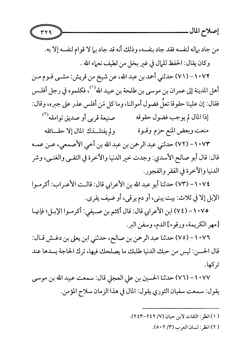 76 - حَدَّثَنَا الْحُسَيْنُ بْنُ عَلِيٍّ الْعِجْلِيُّ, قَالَ: سَمِعْتُ عُبَيْدَ اللهِ بْنَ مُوسَى, يَقُولُ: سَمِعْتُ سُفْيَانَ الثَّوْرِيَّ, يَقُولُ: الْمَالُ فِي هَذَا الزَّمَانِ سِلاَحُ الْمُؤْمِنِ.