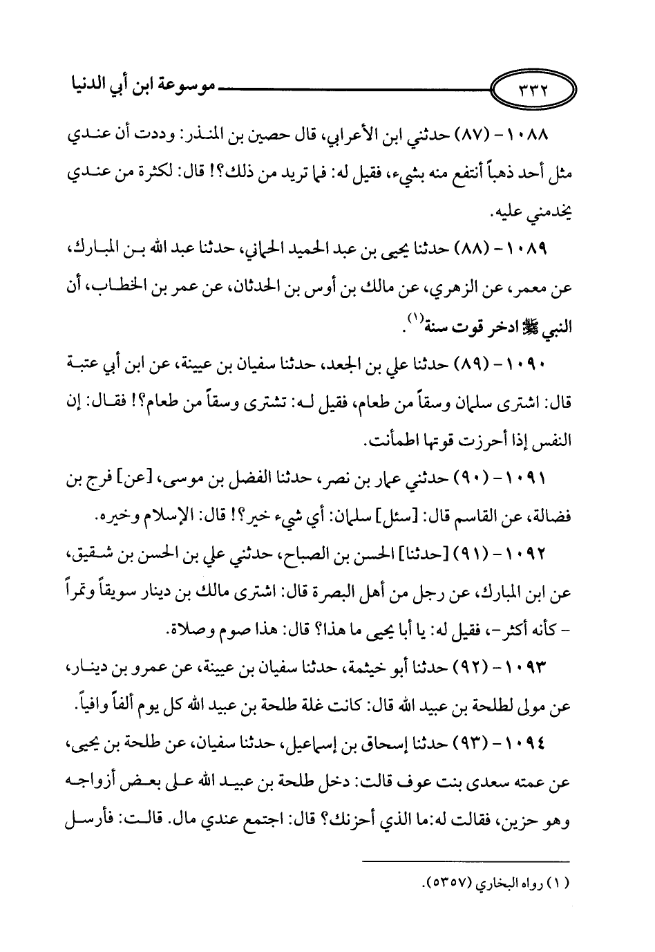 93 - حَدَّثَنَا إِسْحَاقُ بْنُ إِسْمَاعِيلَ, حَدَّثَنَا سُفْيَانُ, عَنْ طَلْحَةَ بْنِ يَحْيَى, عَنْ عَمَّتِهِ سُعْدَى بِنْتِ عَوْفٍ, قَالَتْ: دَخَلَ طَلْحَةُ بْنُ عُبَيْدِ اللهِ عَلَى بَعْضِ أَزْوَاجِهِ وَهُوَ حَزِينٌ, فَقَالَتْ لَهُ: مَا الَّذِي أَحْزَنَكَ؟ قَالَ: اجْتَمَعَ عِنْدِي مَالٌ. قَالَتْ: فَأَرْسِلْ إِلَى قَوْمِكَ فَاقْسِمْهُ بَيْنَهُمْ. فَأَرْسَلَ إِلَى قَوْمِهِ فَقَسَمَهُ فِيهِمْ. فَسَأَلْتُ الْخَازِنَ: كَمْ قَسَمَ يَوْمَئِذٍ؟ [قَالَ]: أَرْبَعَ مِئَةِ أَلْفٍ.