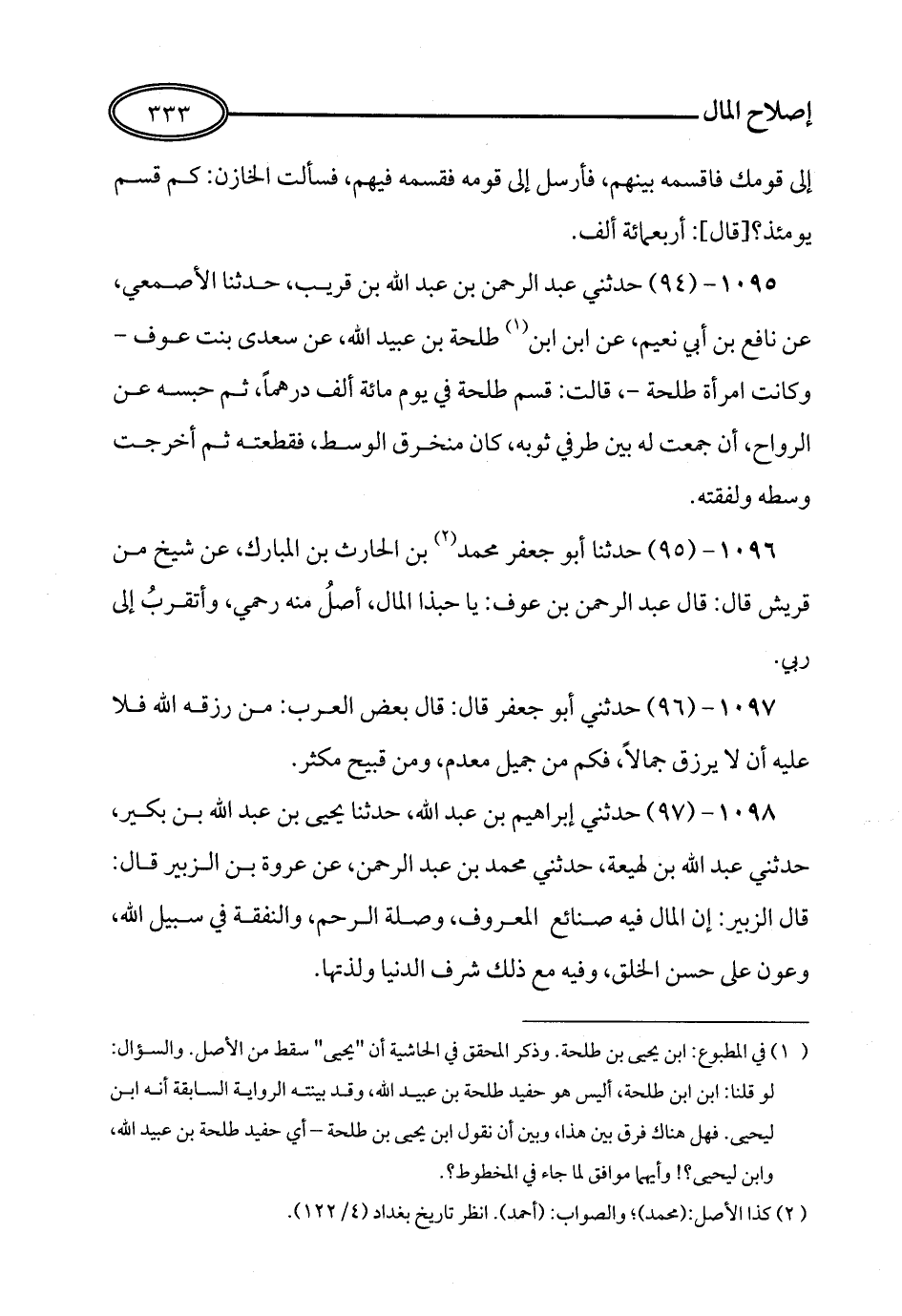 95 - حَدَّثَنَا أَبُو جَعْفَرٍ أَحْمَدُ (1) بْنُ الْحَارِثِ بْنِ الْمُبَارَكِ, عَنْ شَيْخٍ مِنْ قُرَيْشٍ, قَالَ: قَالَ عَبْدُ الرَّحْمَنِ بْنُ عَوْفٍ: يَا حَبَّذَا الْمَالُ, أَصِلُ مِنْهُ رَحِمِي, وَأَتَقَرَّبُ إِلَى رَبِّي عَزَّ وَجَلَّ.