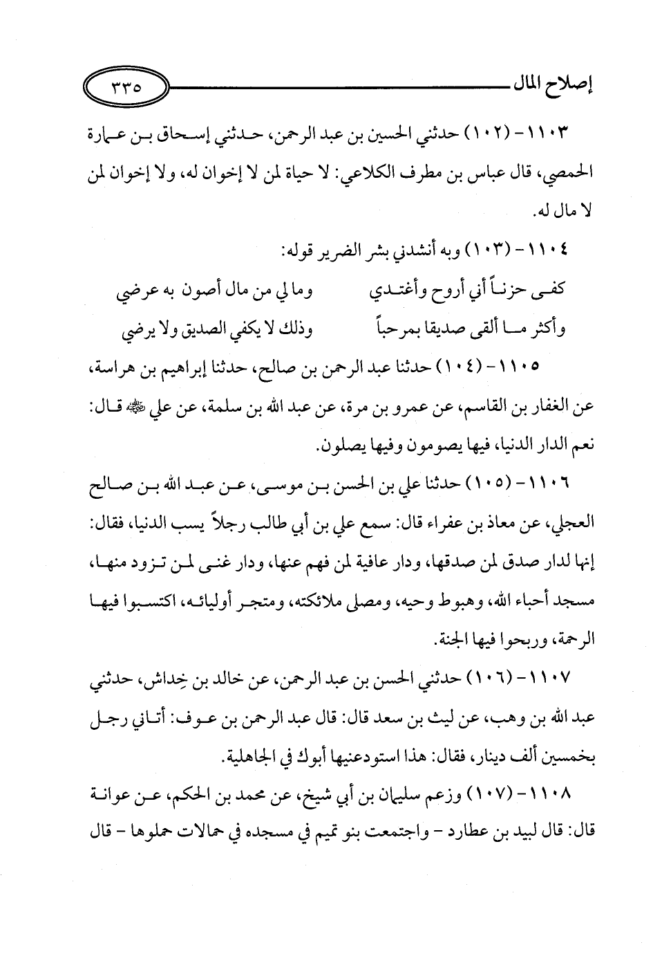 102 - حَدَّثَنِي الْحُسَيْنُ بْنُ عَبْدِ الرَّحْمَنِ, حَدَّثَنِي إِسْحَاقُ بْنُ عُمَارَةَ الْحِمْصِيُّ, قَالَ عَبَّاسُ بْنُ مُطَرِّفٍ الْكَلاَعِيُّ: لاَ حَيَاةَ لِمَنْ لاَ إِخْوَانَ لَهُ, وَلاَ إِخْوَانَ لِمَنْ لاَ مَالَ لَهُ.