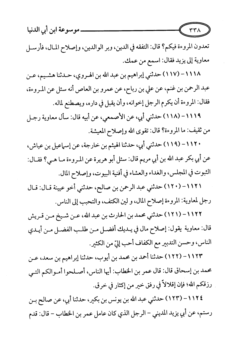 117 - حَدَّثَنِي إِبْرَاهِيمُ بْنُ عَبْدِ اللهِ بن الْهَرَوِيُّ, حَدَّثَنَا هُشَيْمٌ, عَنْ عَبْدِ الرَّحْمَنِ بْنِ غَنْمٍ, عَنْ عَلِيِّ بْنِ رَبَاحٍ, عَنْ عَمْرِو بْنِ الْعَاصِ, أَنَّهُ سُئِلَ عَنِ الْمُرُوءَةِ, فَقَالَ: الْمُرُوءَةُ أَنْ يُكْرِمَ الرَّجُلُ إِخْوَانَهُ, وَأَنْ يَقْبَلَ فِي دَارِهِ, وَيَصْطَنِعَ لِمَالِهِ.