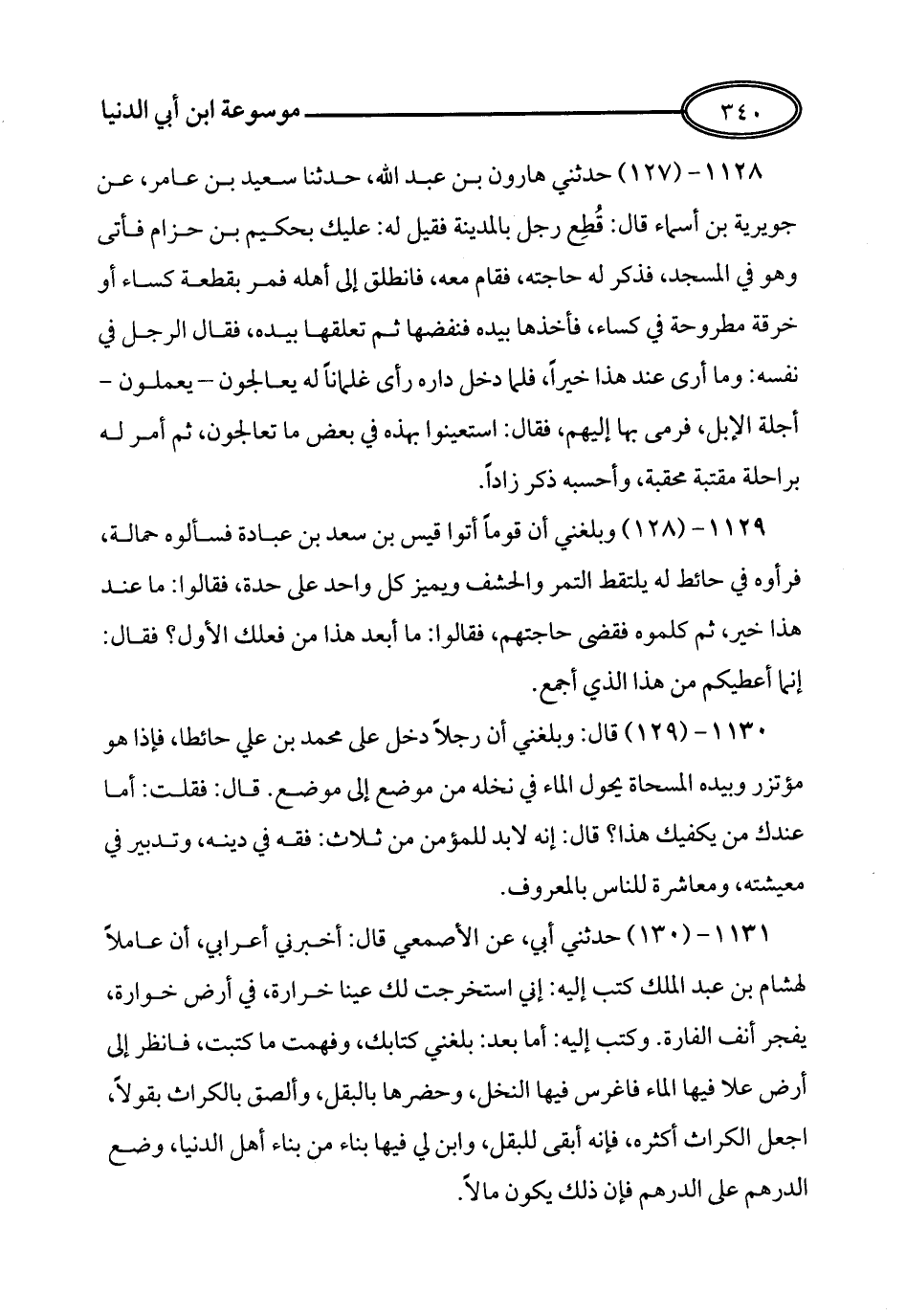 129 - قَالَ: وَبَلَغَنِي أَنَّ رَجُلاً دَخَلَ عَلَى مُحَمَّدِ بْنِ عَلِيٍّ حَائِطًا, فَإِذَا هُوَ مُؤْتَزِرٌ وَبِيَدِهِ الْمِسْحَاةُ يُحَوِّلُ الْمَاءَ فِي نَخْلِهِ مِنْ مَوْضِعٍ إِلَى مَوْضِعٍ, قَالَ: فَقُلْتُ: أَمَا عِنْدَكَ مَنْ يَكْفِيكَ هَذَا؟ قَالَ: إِنَّهُ لاَبُدَّ لِلْمُؤْمِنِ مِنْ ثَلاَثٍ: فِقْهٌ فِي دِينِهِ, وَتَدْبِيرٌ فِي مَعِيشَتِهِ, وَمُعَاشَرَةٌ لِلنَّاسِ بِالْمَعْرُوفِ.
