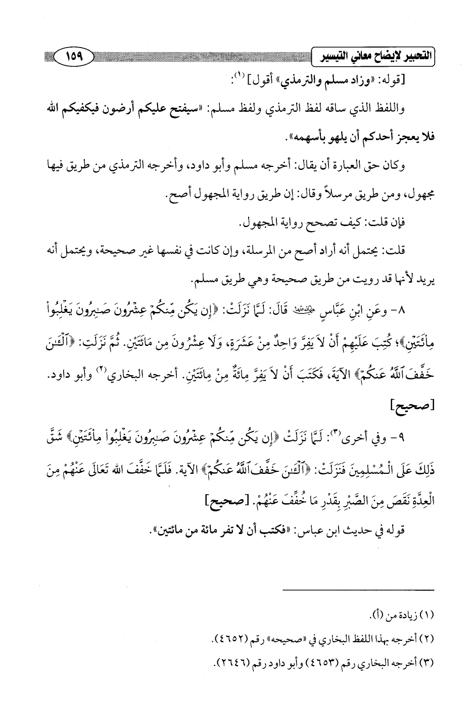 8 - وعَنِ ابْنِ عَبَّاسٍ - رضي الله عنهما - قَالَ: لَمَّا نَزَلَتْ: {إِنْ يَكُنْ مِنْكُمْ عِشْرُونَ صَابِرُونَ يَغْلِبُوا مِائَتَيْنِ}؛ كُتِبَ عَلَيْهِمْ أَنْ لاَ يَفِرَّ وَاحِدٌ مِنْ عَشَرَةٍ، وَلَا عِشْرُونَ مِن مَائَتَيْنِ. ثُمَّ نَزَلَتِ: {الْآنَ خَفَّفَ اللَّهُ عَنْكُمْ} الآيَةَ، فَكَتَبَ أَنْ لاَ يَفِرَّ مِائَةٌ مِنْ مِائَتَيْنِ. أخرجه البخاري (¬2) وأبو داود. [صحيح]
